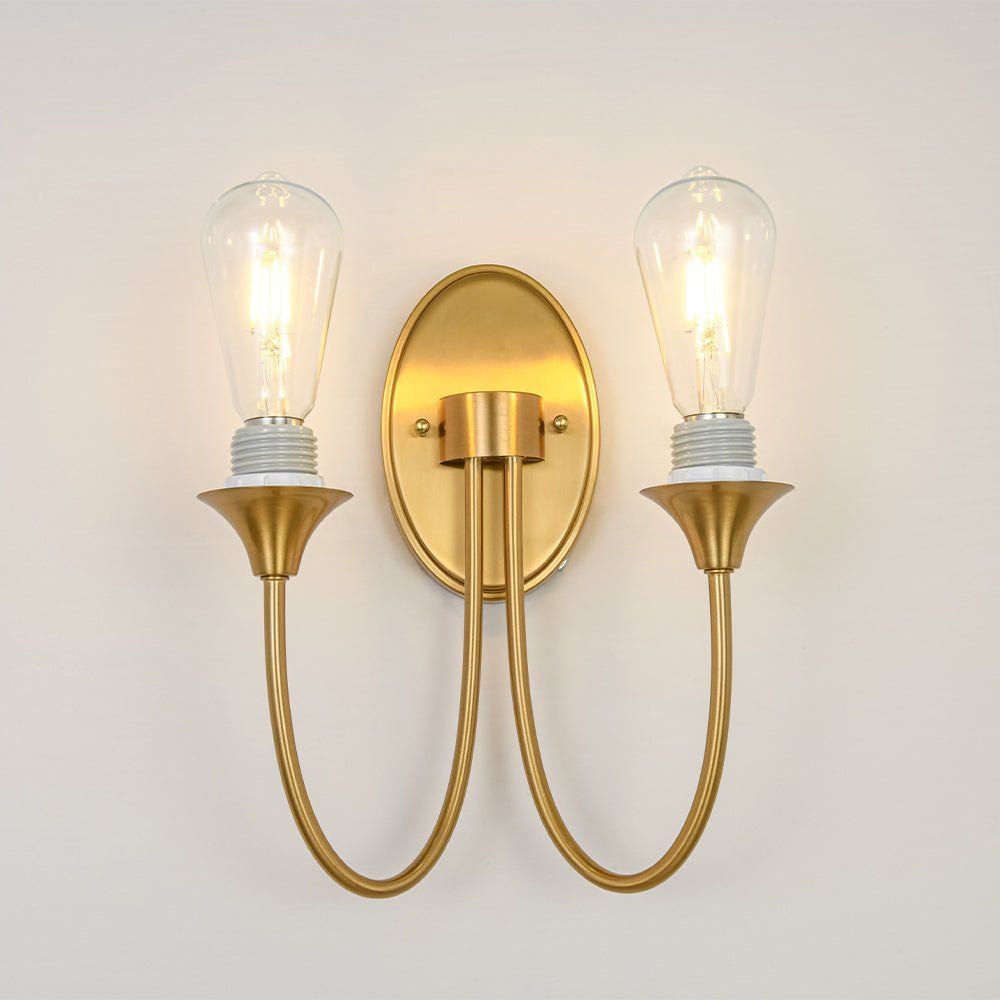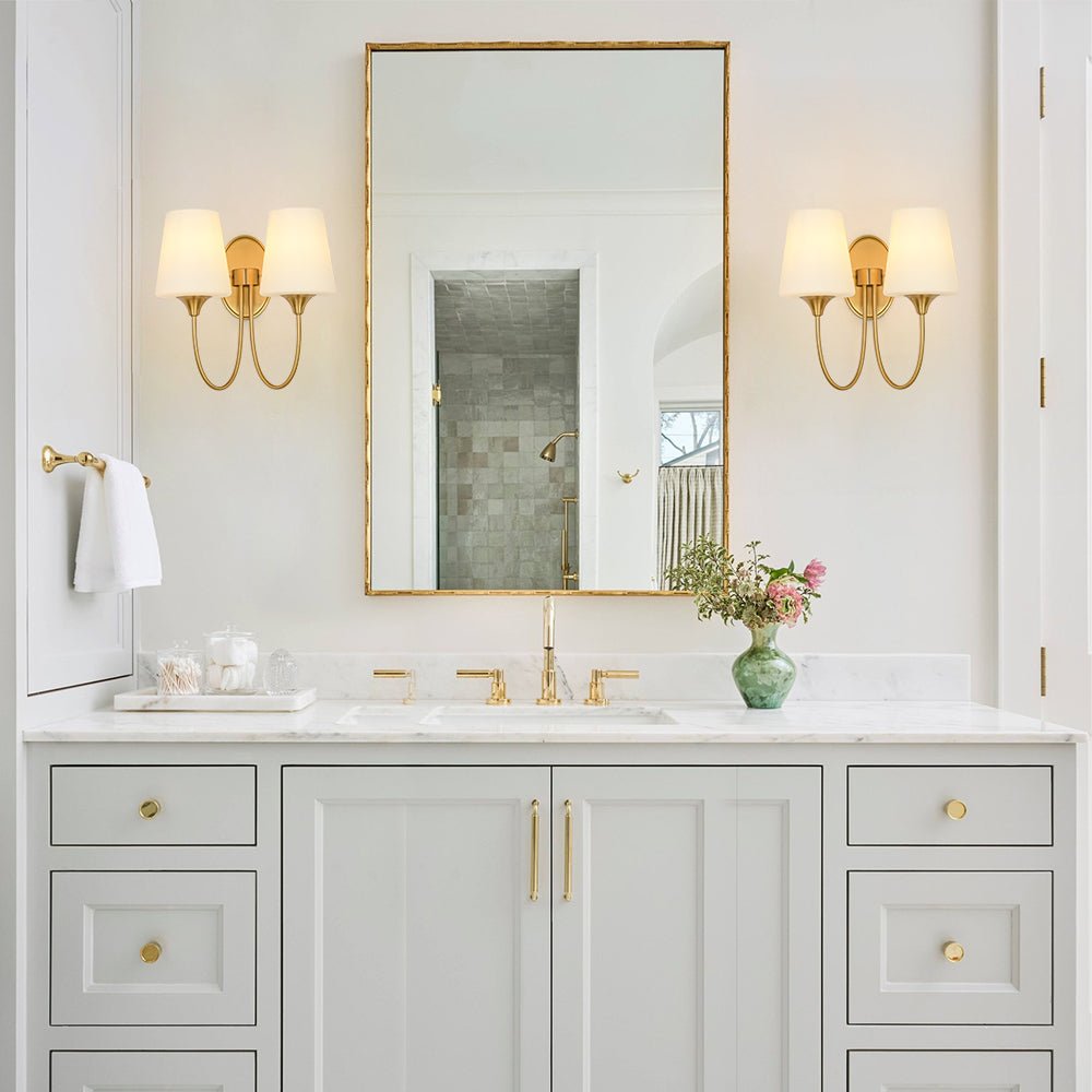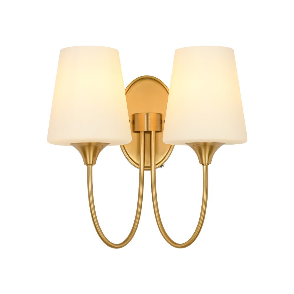 Cast a touch of timeless elegance to your home with this 2-light conical matte glass wall sconce, designed to illuminate your space with style and sophistication. The curved arms gently resemble two U-shapes, creating a graceful and balanced silhouette, while the frosted conical shades soften the light, casting a warm and inviting glow. The oval backplate exudes a French flair, making it the perfect addition to traditional, transitional, or vintage-inspired interiors. Whether in the living room, bedroom, dining room, kitchen, hallway, or bathroom, this fixture effortlessly elevates your space with its charming and functional design.