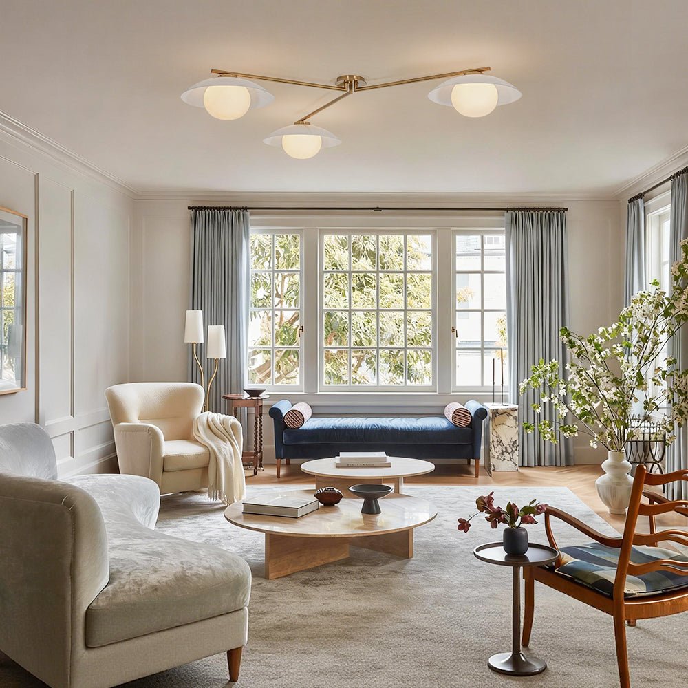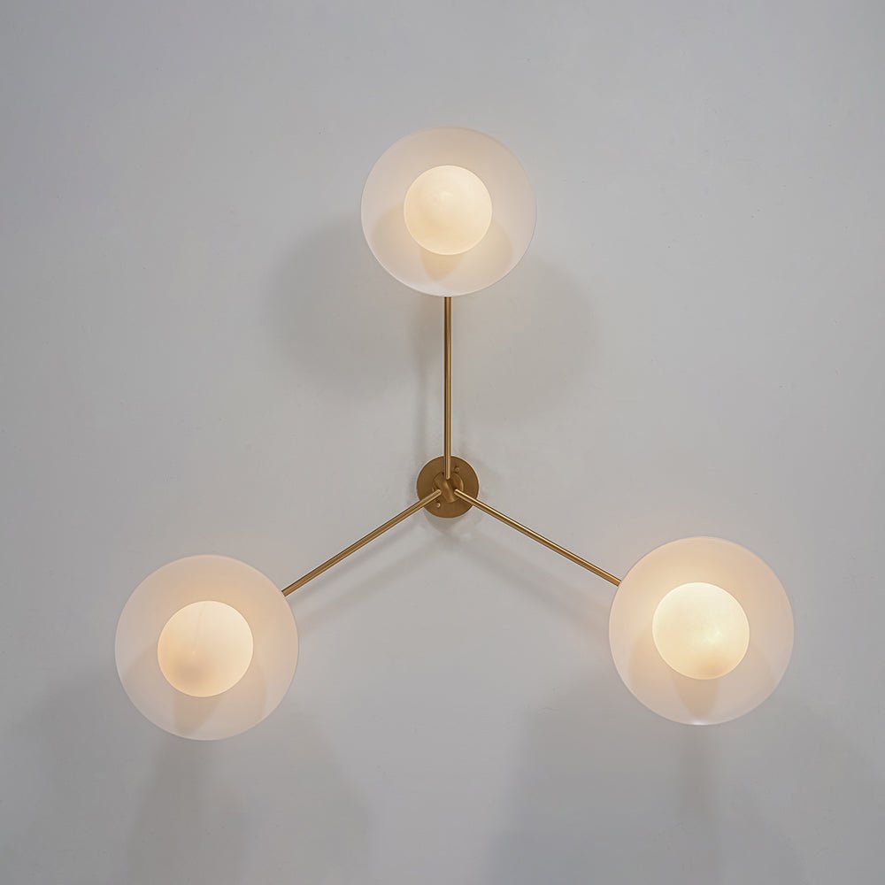 Chic yet funky, this 3-light frosted glass blooming bud semi-flush mount marries symmetry with refined charm: its balanced metal arms in warm brass and frosted glass globes mimic blooming flower buds nestled under domed shades, crafting a two-tone design golden warmth and crisp white glass that feels unexpectedly exquisite. The symmetrical framework grounds the soft, bud-like globes, blending structured elegance with organic whimsy. It infuses spaces with understated luxury, suiting transitional, soft contemporary, or classic modern interiors, ideal for living rooms, sitting areas, or sophisticated bedrooms.
