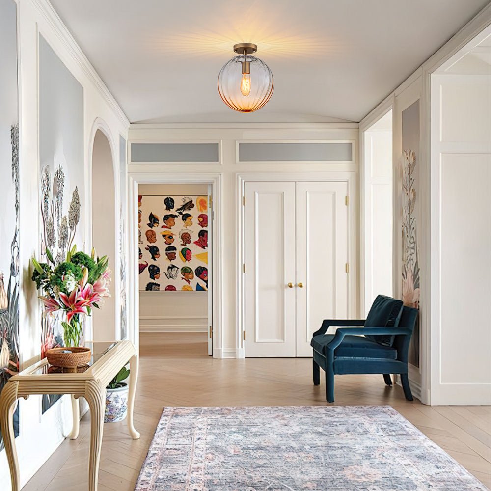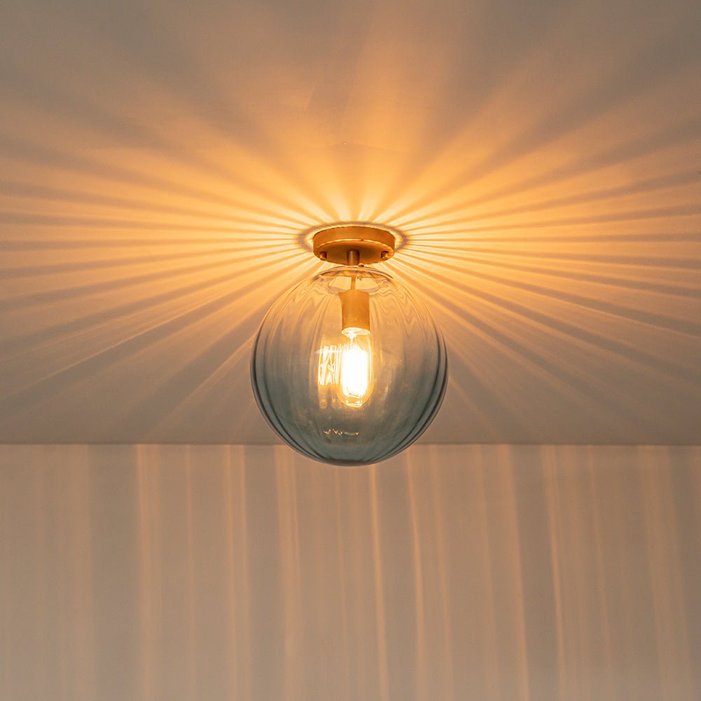 Glowing like a quiet sunburst, this minimalism 1-light flush mount fixture fuses minimalist elegance with radiant artistry. Featuring a gradient ribbed clear glass globe shade, it casts unparalleled light reflections across the ceiling, creating a halo of warmth and depth. Anchored by a brushed brass canopy, the refined silhouette adds a touch of timeless sophistication to any space. Perfect for intimate entryways, cozy hallways, modern bathrooms, or serene bedrooms, this piece offers a versatile glow that elevates the everyday. The textured striped glass globe softly diffuses light, turning any bulb into a sculptural focal point. Whether installed solo or in multiples, it brings quiet drama and refined charm to interiors with modern, transitional, or even vintage flair.