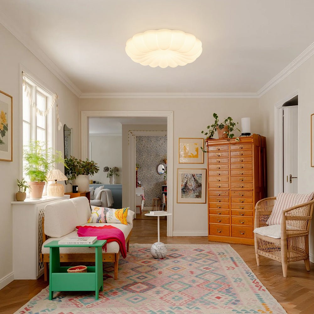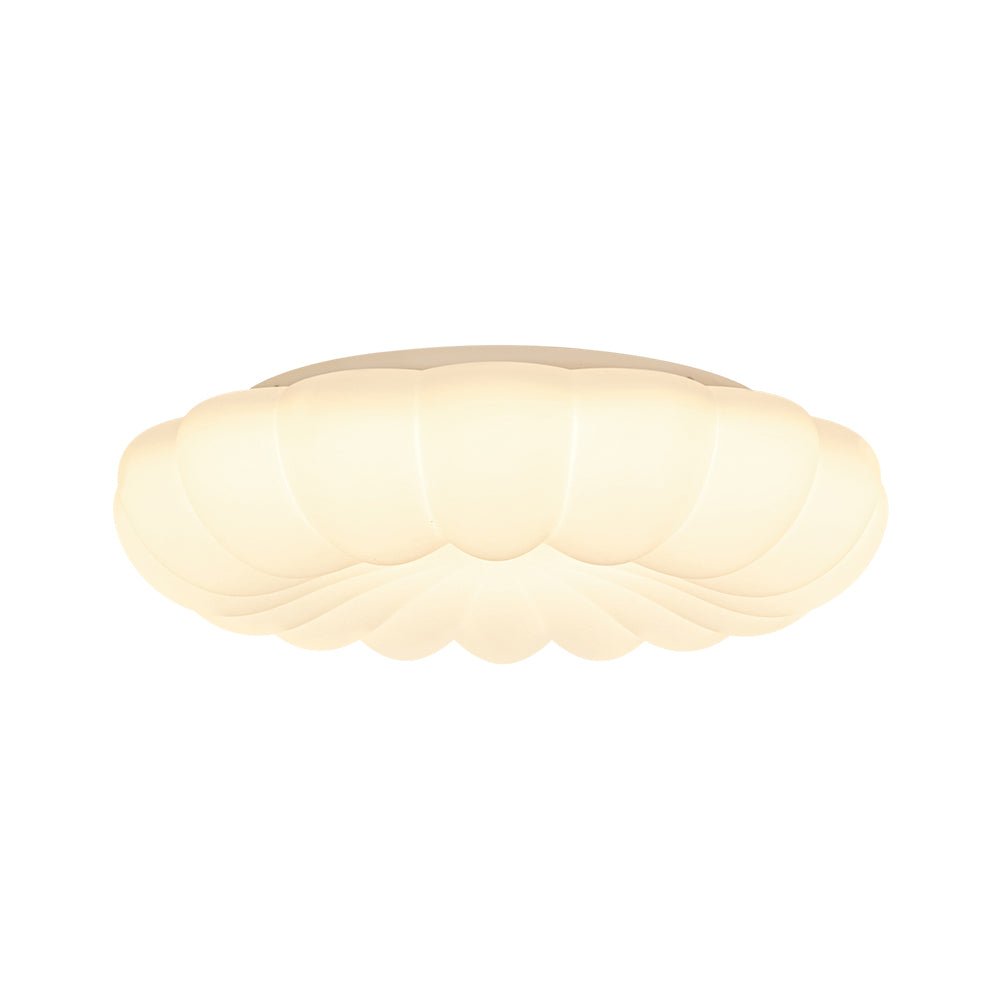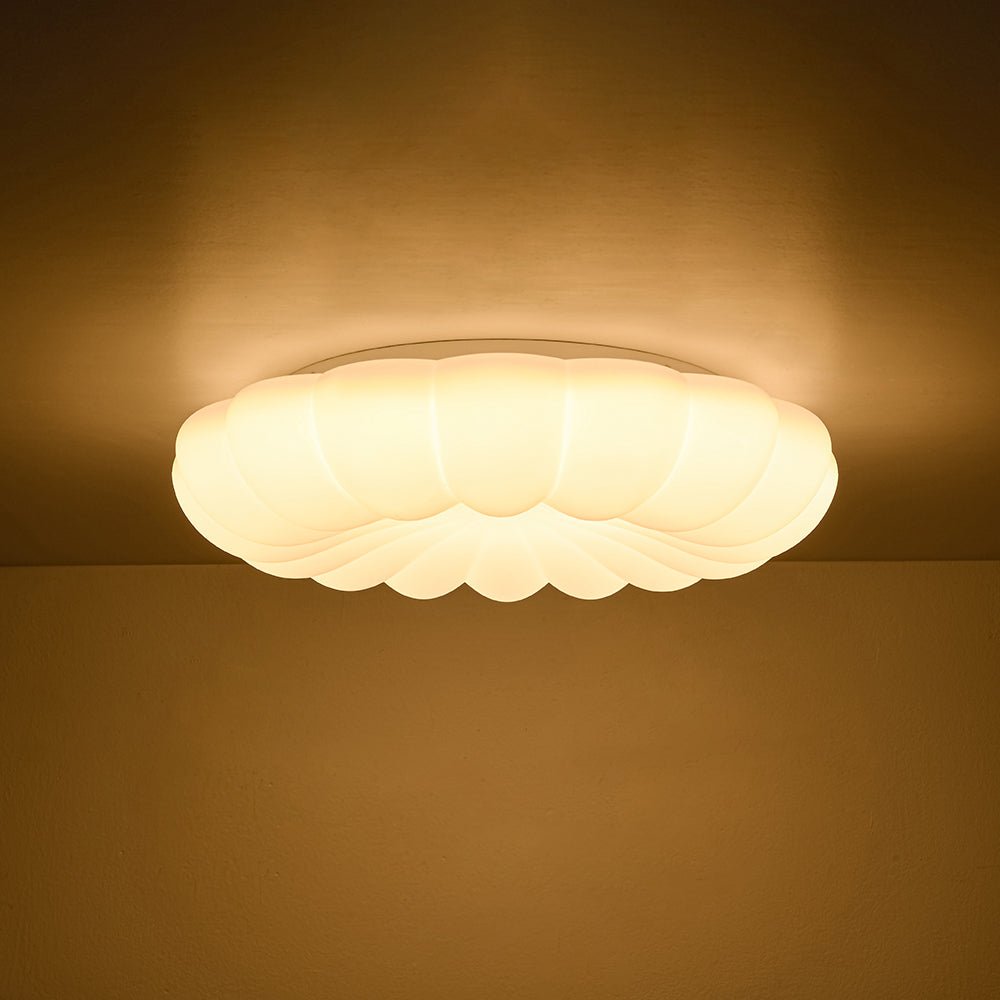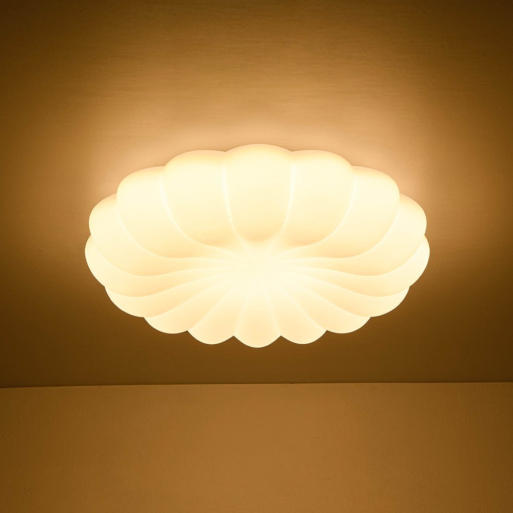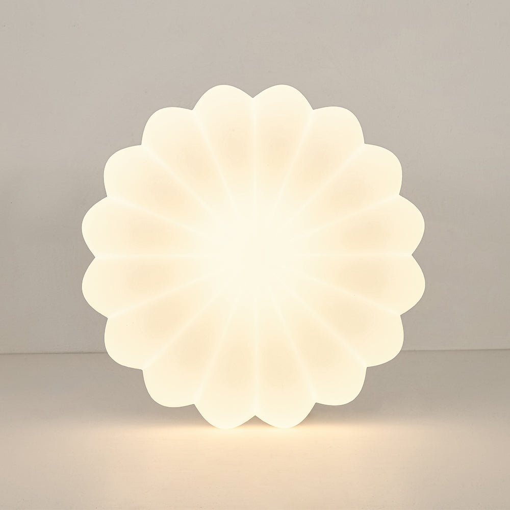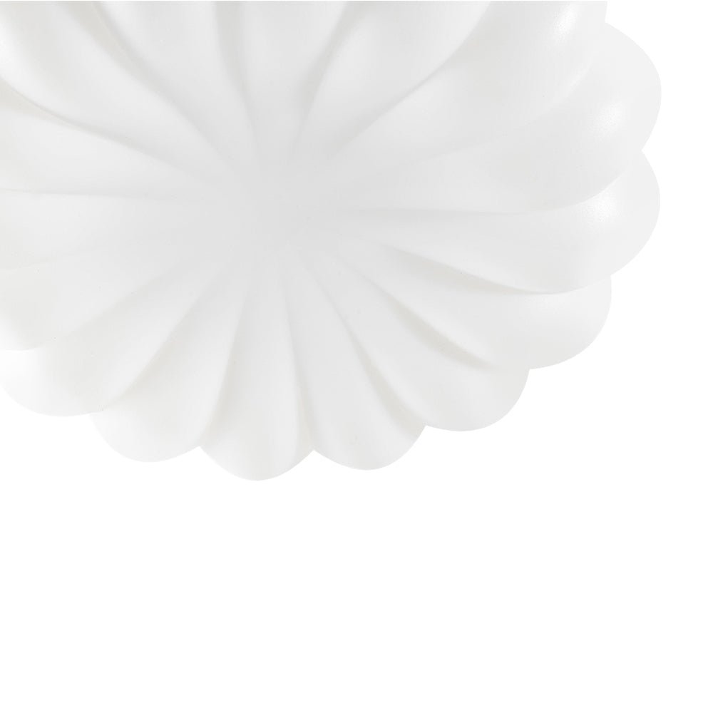 Blooms like a three-dimensional daisy on your ceiling, this modern white scalloped daisy dimmable LED flush mount ceiling light features white PE shade features soft, petal-like scallops that create a gentle, dimensional visual impact. Equipped with integrated LED technology, it casts a customizable, warm glow to craft the ideal ambiance for any space. Blending playful charm with modern minimalism, it suits contemporary, and soft modern interiors—perfect for nurseries, entryways, bedrooms, dining rooms, and living rooms, where it infuses spaces with whimsical warmth.