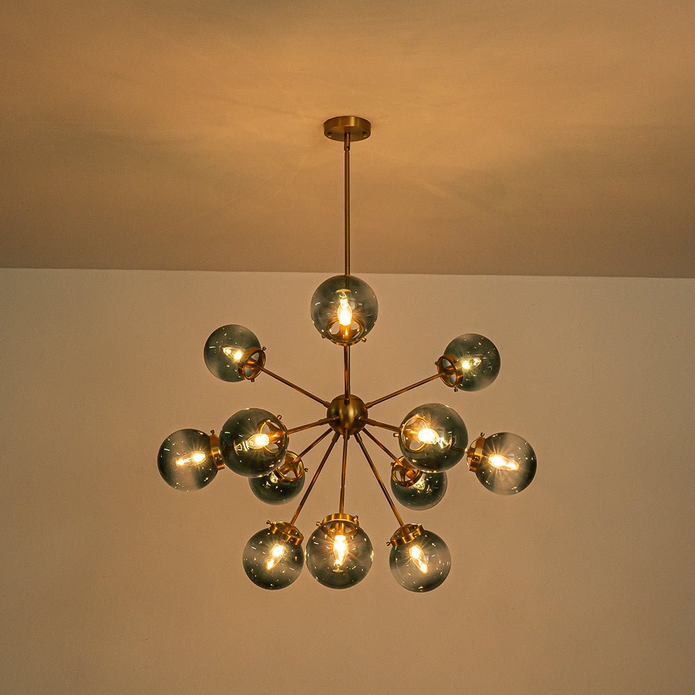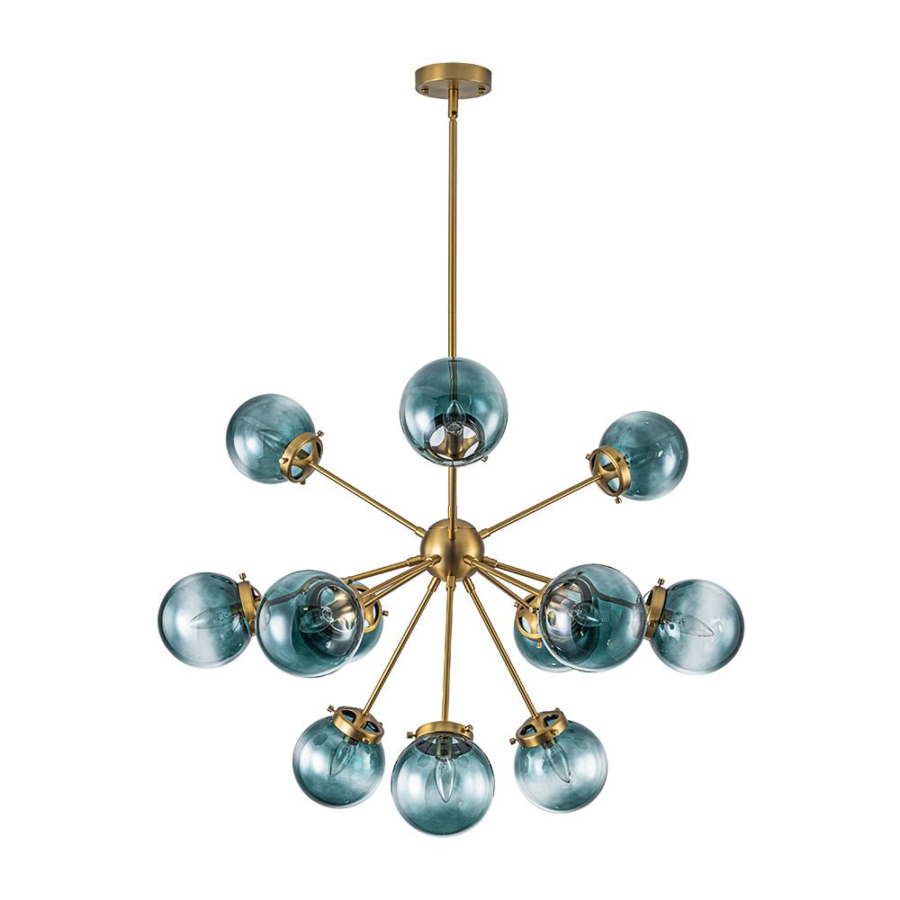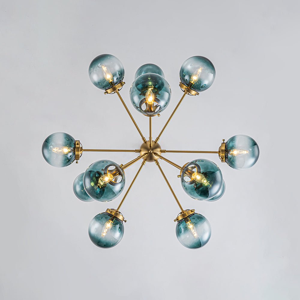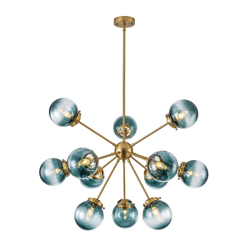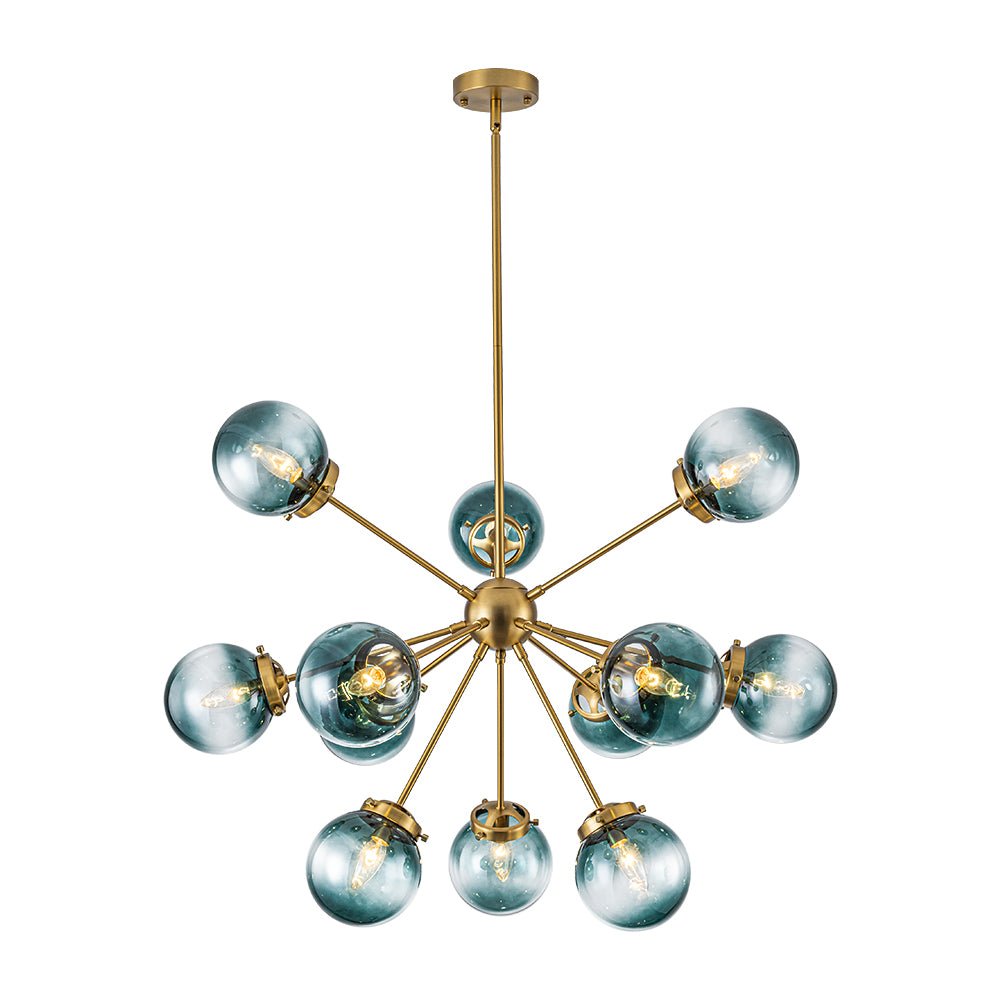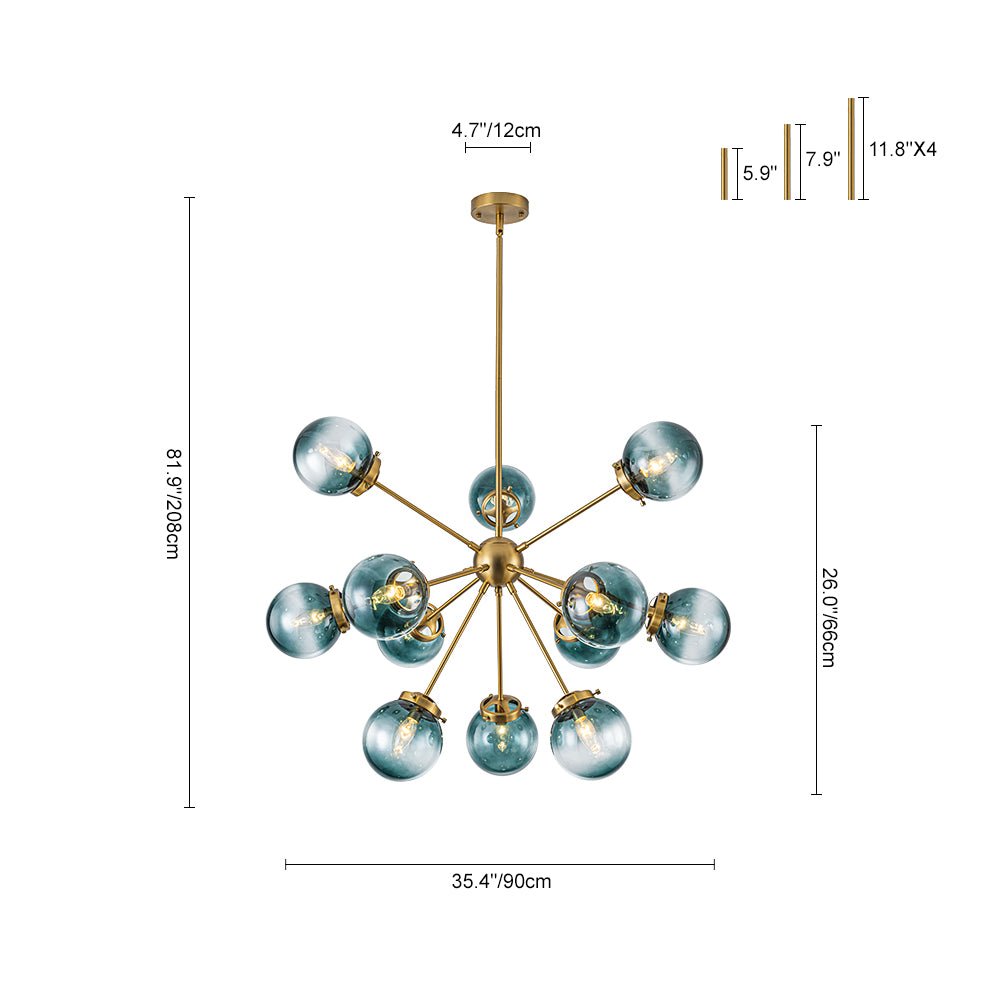 Striking, sculptural, and brilliantly modern, this 12-light sputnik sphere chandelier makes an unforgettable statement in any room that craves artistic impact. Radiating from a polished brass core, each arm is crowned with a two-tone glass globe, lake-blue fading into clear transparency, adding a refreshing pop of color and a soft luminous edge to the fixture. These shimmering globes become the defining touch, transforming the classic sputnik form into something bold, funky, and elegantly elevated. Perfect for interiors that celebrate personality, such as living rooms, dining spaces, kitchens, bedrooms, and entryways, this stunning chandelier brings both sculptural drama and warm, inviting illumination. With every angle catching the light, this fixture becomes a vibrant centerpiece that emboldens your décor with confident, modern beauty.