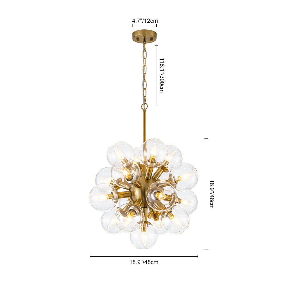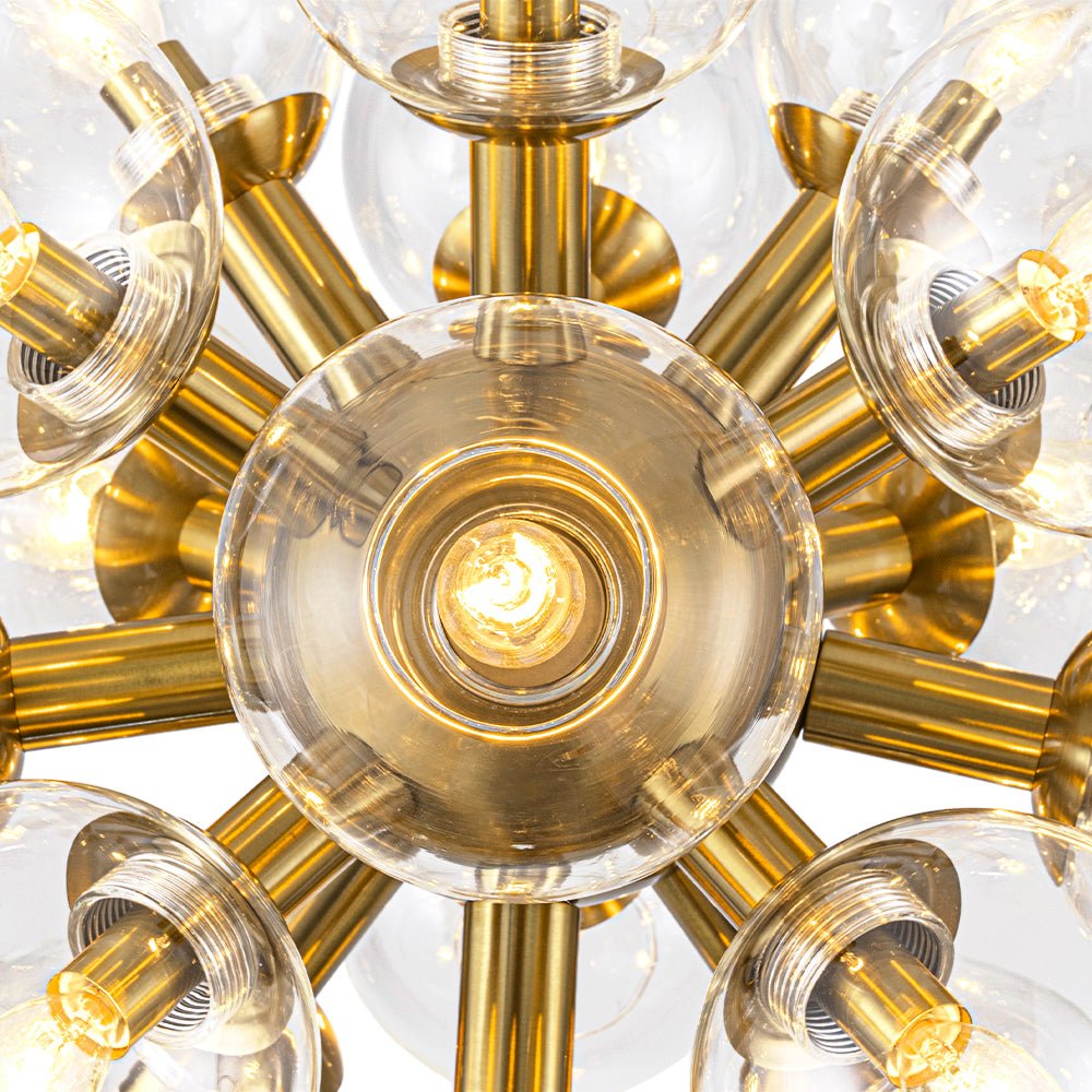 Radiant, airy, and strikingly sculptural, this modern 17-light firework sphere chandelier brings an unforgettable burst of mid-century modern charm to any interior. From its polished metallic core, evenly spaced cylindrical lamp holders stretch outward, forming a perfectly balanced globe silhouette. Each arm supports a hand-blown transparent glass shade, whose open-ended design creates an effortless lightness—almost as if the fixture were floating midair. When illuminated, the fixture resembles a dazzling firework blooming against the night sky, its warm glow reflecting gently through the crystal-clear globes. The harmony between sleek metal and airy glass gives the chandelier a sophisticated yet spirited presence, making it an ideal statement piece for modern living rooms, dining rooms, kitchens, bedrooms, bathrooms, or elegant entryways. Whether you’re aiming to elevate a contemporary home or highlight a mid-century–inspired space, this bold design infuses any room with artistry, balance, and luminous beauty.