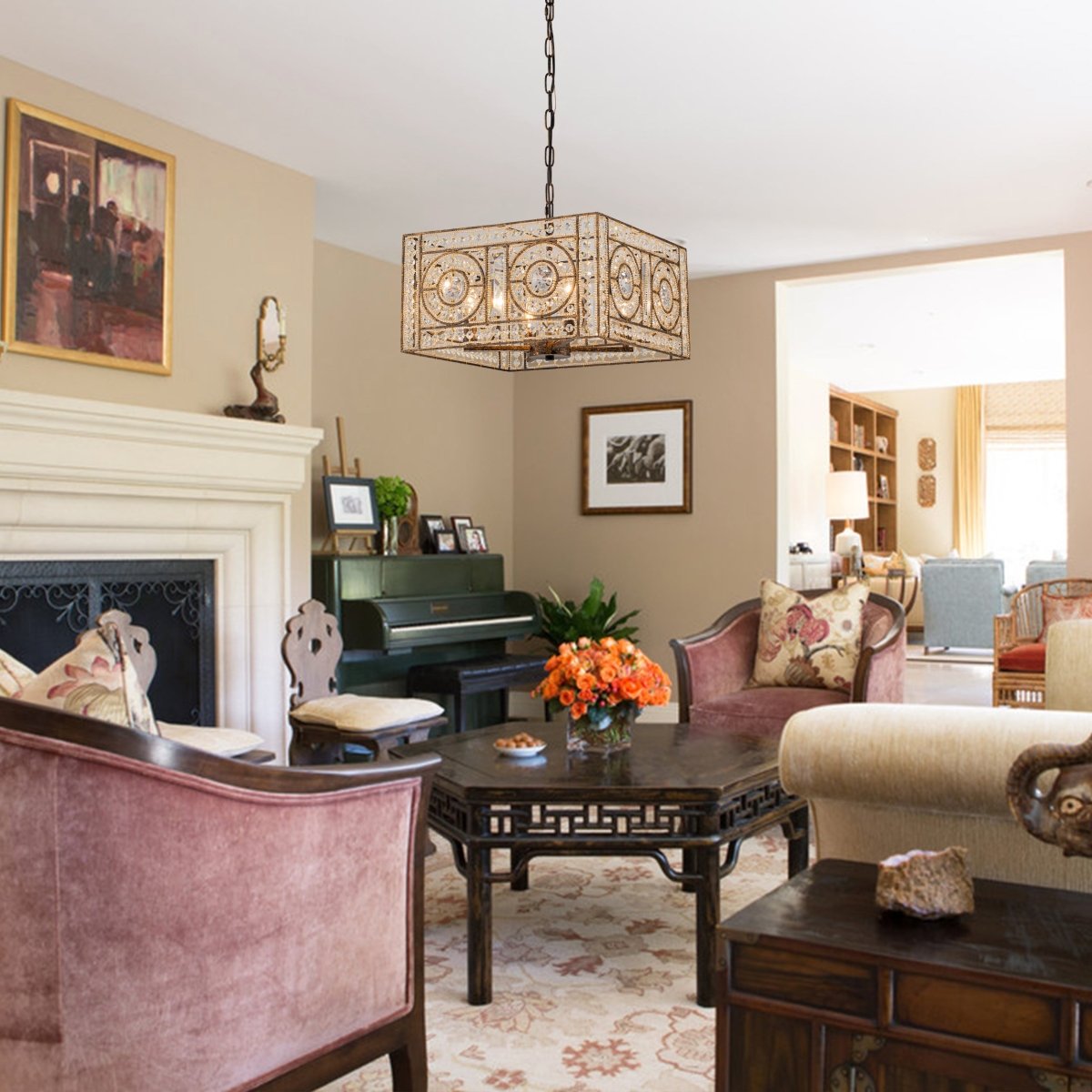 Effortlessly indulge in luxury with our French-style vintage mottled bronze square 4-light crystal pendant. Experience a home that exudes elegance and sophistication, inspired by the breathtaking architecture and timeless art of an enchanting era. Find yourself transported on a moonlit stroll along the iconic St. Paul's Cathedral with every piece from the New-Age Renaissance collection. Transform your home into a luxurious oasis with this gorgeous dark bronze iron square frame adorned with sparkling crystals. Pair it with stunning golden Persian rugs for a touch of opulence in any room of your house, including your living room, dining room, bedroom, entryway, or foyer.