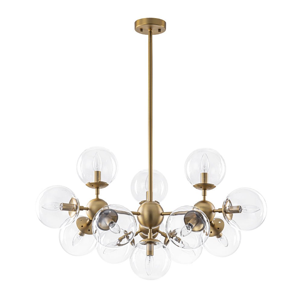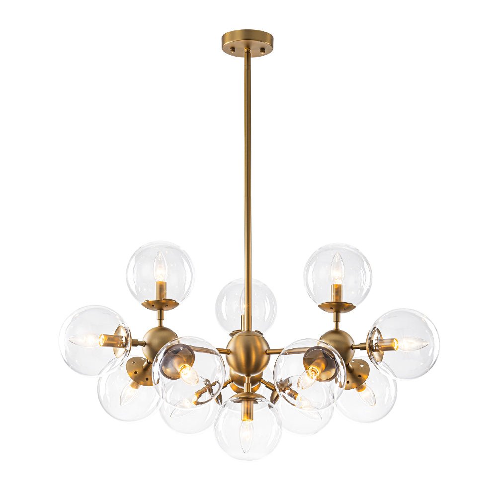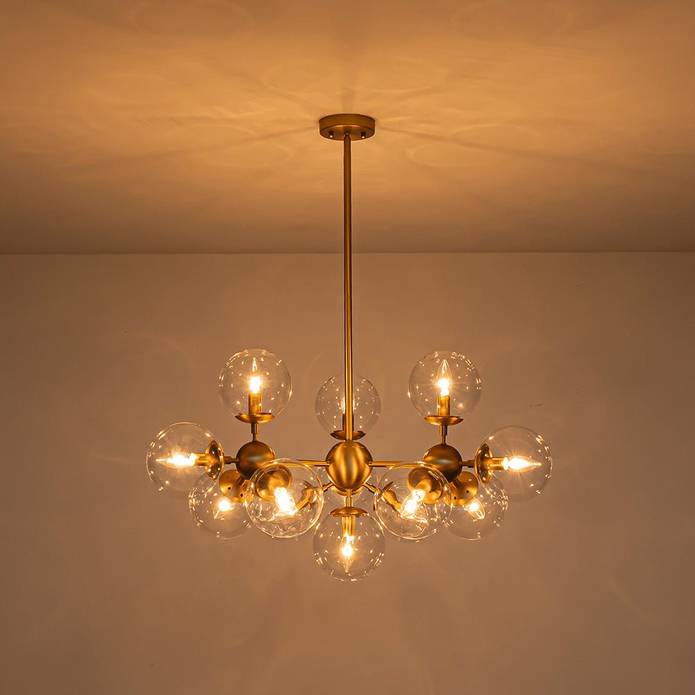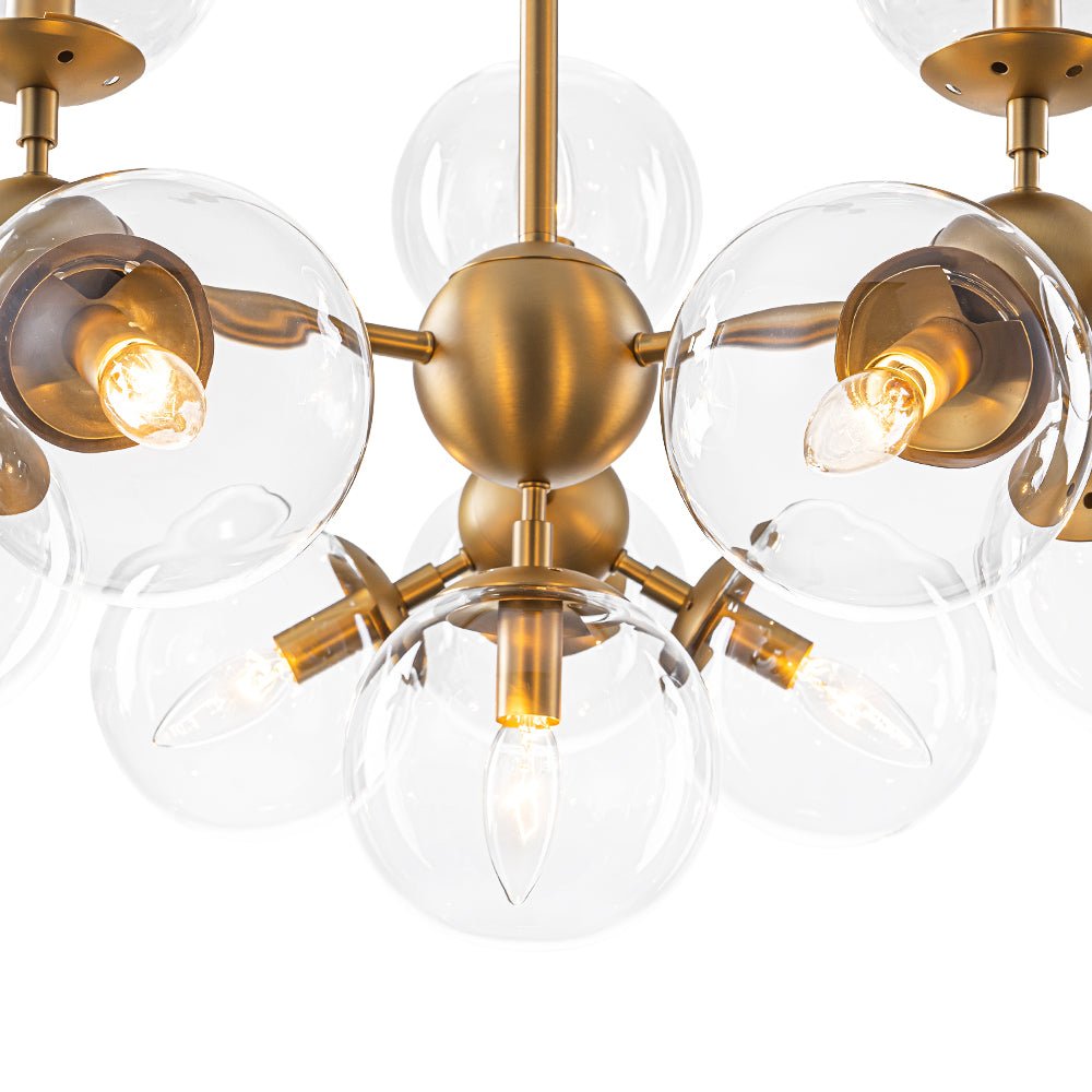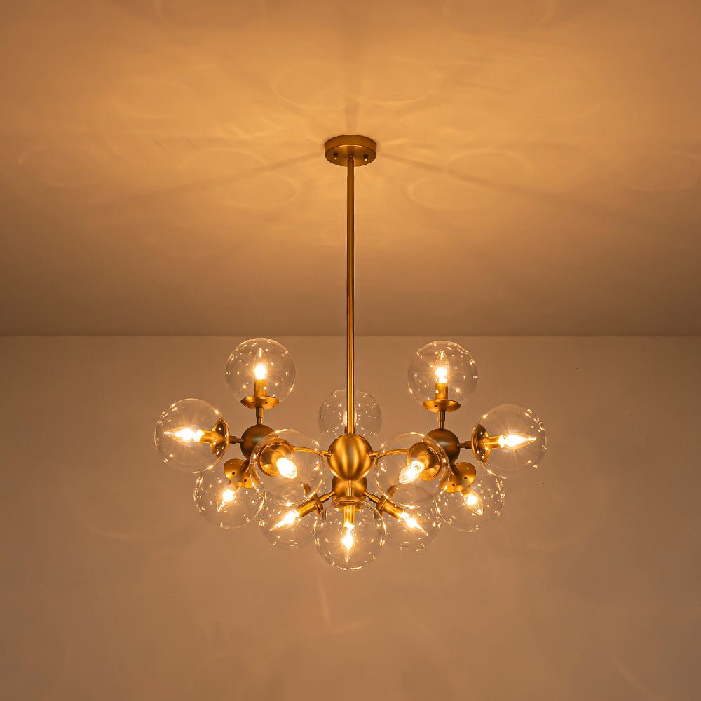 Timeless and captivating, the 13-light mid-century molecular clear glass branch chandelier effortlessly blends the charm of mid-century design with modern flair. Its molecular silhouette, adorned with transparent glass spheres, evokes the beauty of a celestial constellation suspended indoors. The brass branches resemble star trails, while the delicate glass orbs reflect the gentle glow of moonlight. The stunning chandelier conjures the image of a frozen forest, with translucent spheres as morning dew drops, supported by the metal branches. Ideal for adding a sophisticated, yet playful touch to living rooms, dining areas, or entryways, this chandelier brings a celestial, natural beauty to any space.