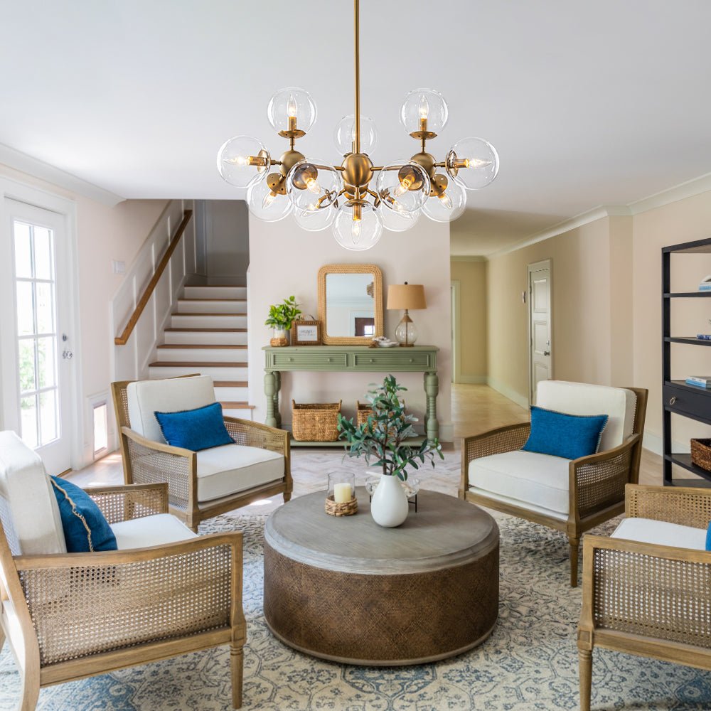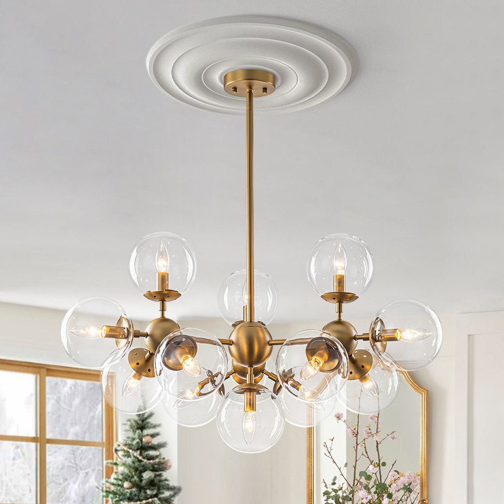 Timeless and captivating, the 13-light mid-century molecular clear glass branch chandelier effortlessly blends the charm of mid-century design with modern flair. Its molecular silhouette, adorned with transparent glass spheres, evokes the beauty of a celestial constellation suspended indoors. The brass branches resemble star trails, while the delicate glass orbs reflect the gentle glow of moonlight. The stunning chandelier conjures the image of a frozen forest, with translucent spheres as morning dew drops, supported by the metal branches. Ideal for adding a sophisticated, yet playful touch to living rooms, dining areas, or entryways, this chandelier brings a celestial, natural beauty to any space.