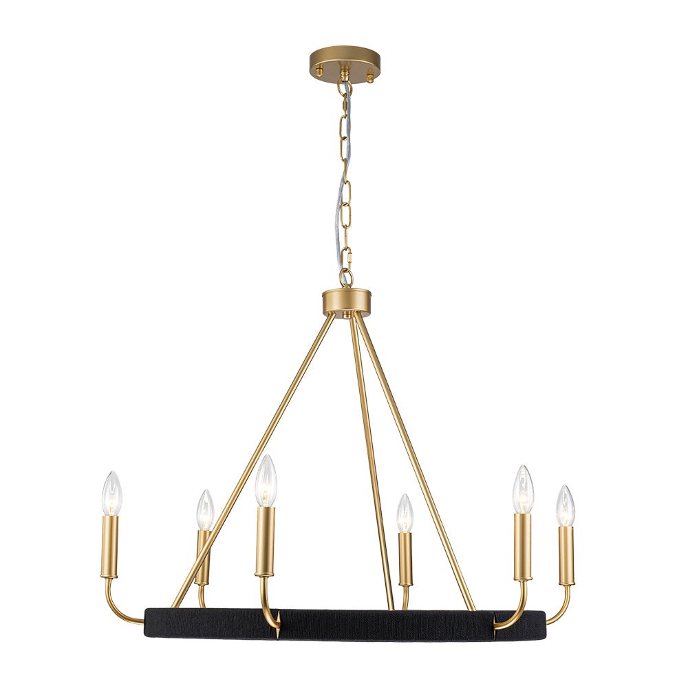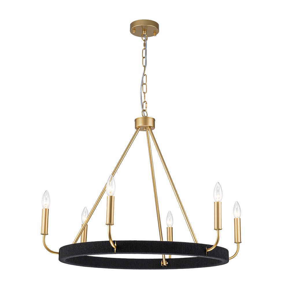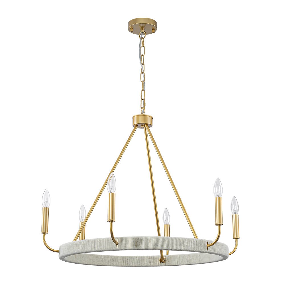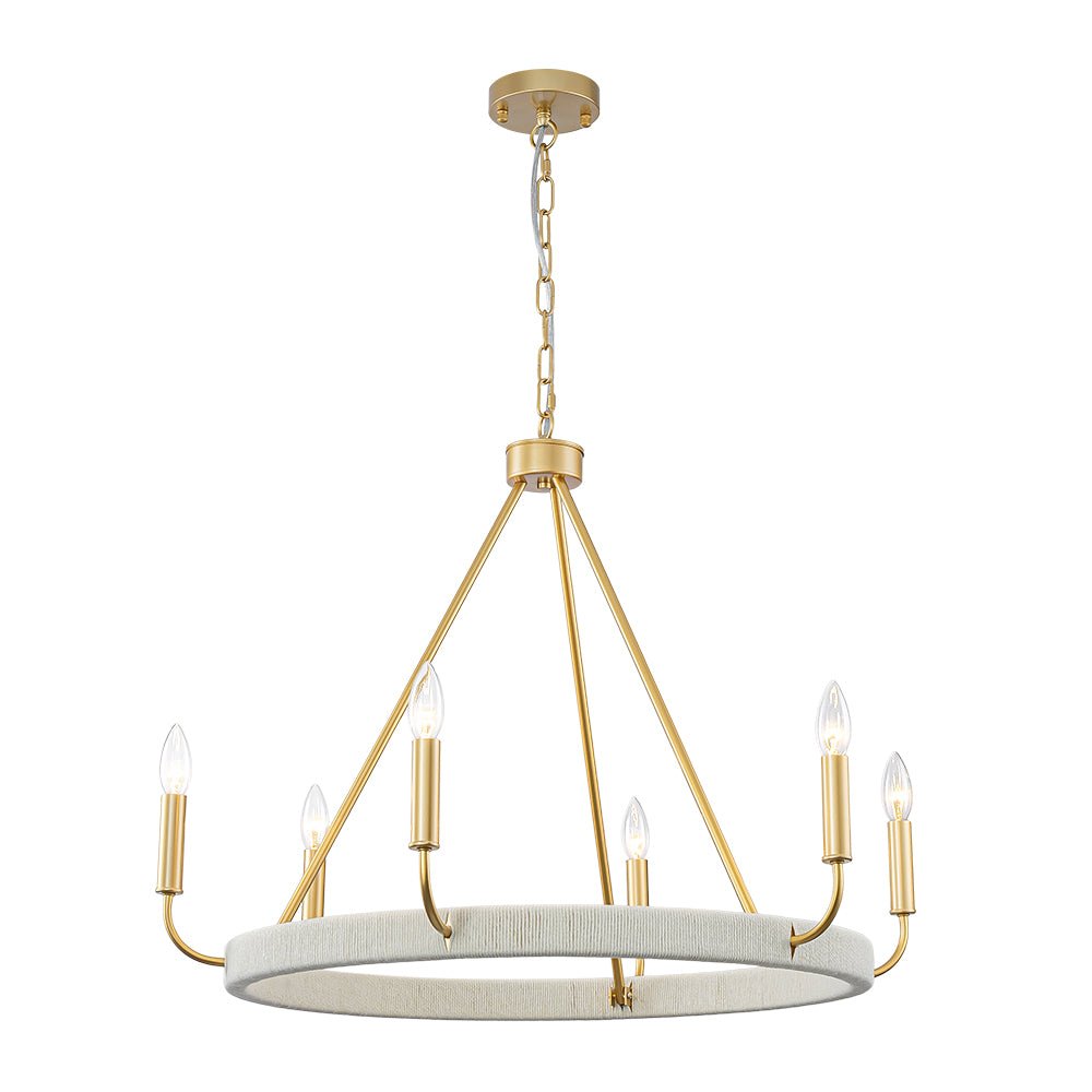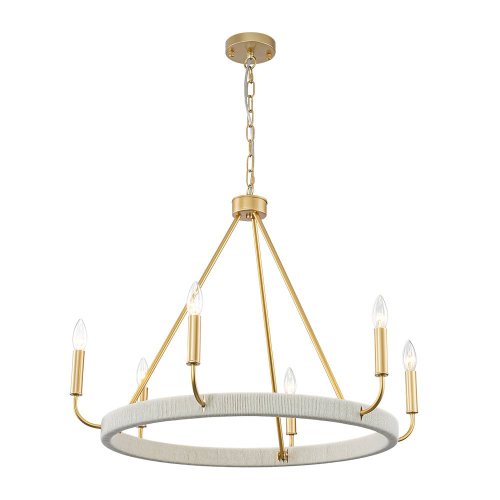 Bridging rustic warmth and mid-century sophistication, the modern rustic 6-light candlestick cotton thread wagon wheel chandelier reimagines classic elegance with a fresh artistic flair. Its round wagon wheel silhouette, gracefully entangled with soft cotton thread, evokes a tactile sense of craftsmanship, while brushed brass arms and candlestick sockets introduce a polished, modern glow. The balance between natural texture and metallic refinement creates a stunning visual rhythm — organic yet luxurious. Make a statement in any setting that celebrates timeless design with a touch of artistry — from modern farmhouse dining rooms and cozy living spaces to chic kitchens, elegant bedrooms, and inviting entryways!