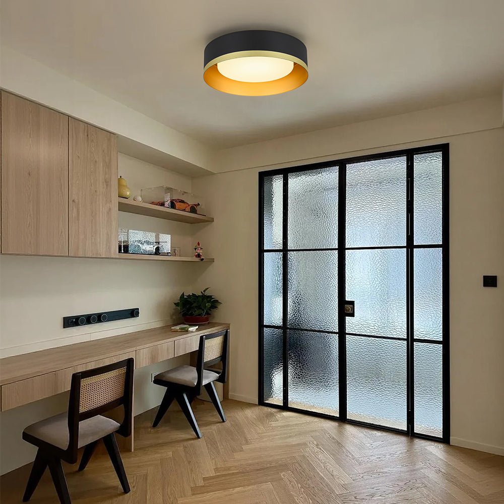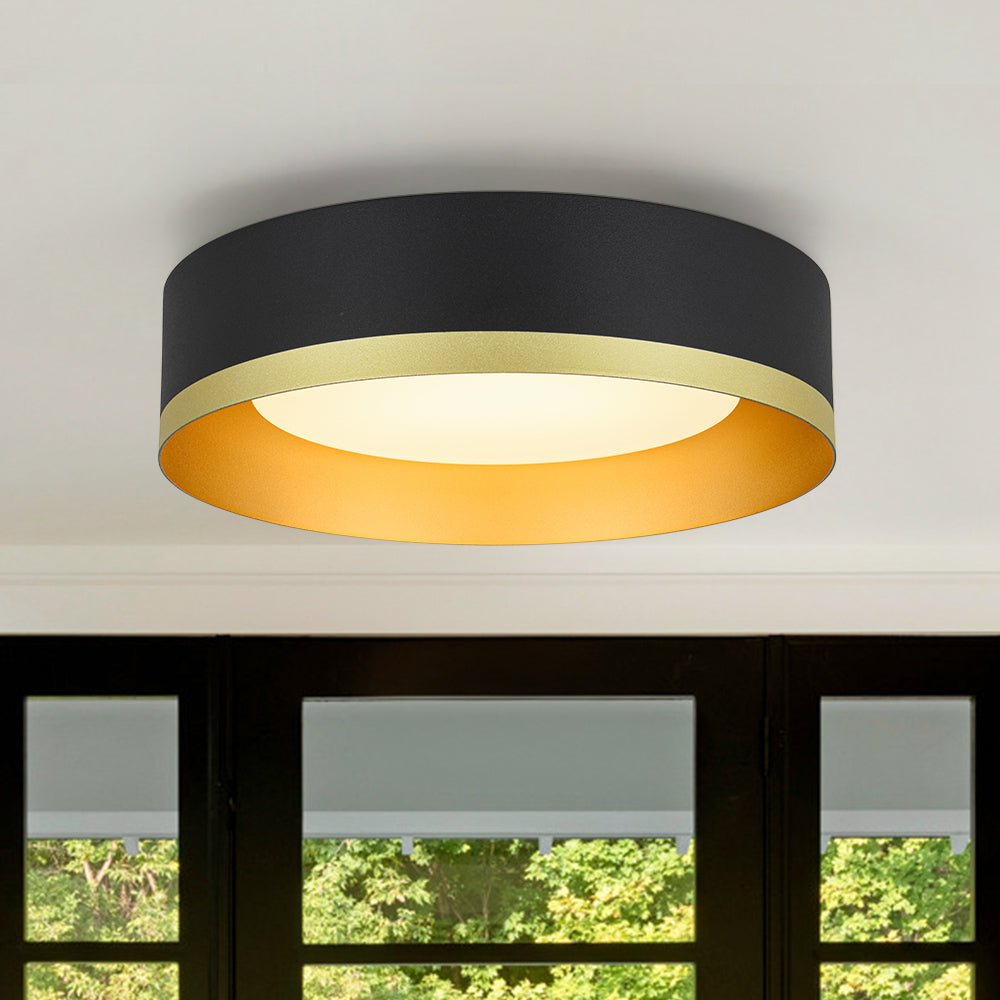 Elevate everyday lighting with this dimmable LED round drum flush mount, where simplicity meets striking contrast. The rounded drum silhouette is framed in a bold gold and black color-blocked design, with a refined gold edge that adds a warm, luminous accent. Its clean lines and two-tone palette make it effortlessly versatile—blending into mid-century, modern, farmhouse, or industrial interiors with ease. Designed for flexibility, the 5 color temperature selectable feature lets you tailor the light from crisp brightness to soft warmth, while dimmable functionality sets the perfect mood. Ideal for bedrooms, kitchens, hallways, or offices, this fixture delivers balanced illumination with timeless, understated style.