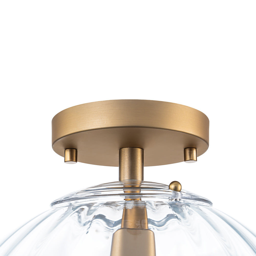 Glowing like a quiet sunburst, this minimalism 1-light flush mount fixture fuses minimalist elegance with radiant artistry. Featuring a gradient ribbed clear glass globe shade, it casts unparalleled light reflections across the ceiling, creating a halo of warmth and depth. Anchored by a brushed brass canopy, the refined silhouette adds a touch of timeless sophistication to any space. Perfect for intimate entryways, cozy hallways, modern bathrooms, or serene bedrooms, this piece offers a versatile glow that elevates the everyday. The textured striped glass globe softly diffuses light, turning any bulb into a sculptural focal point. Whether installed solo or in multiples, it brings quiet drama and refined charm to interiors with modern, transitional, or even vintage flair.