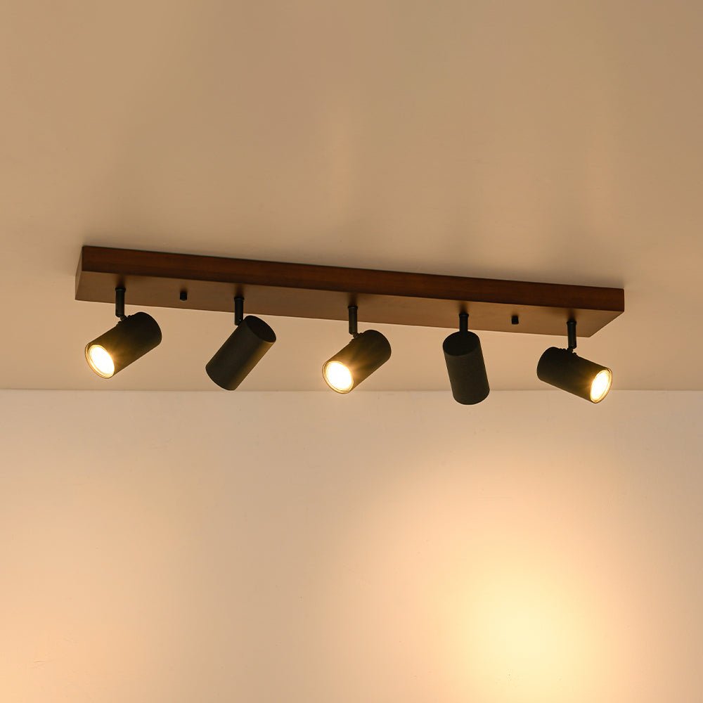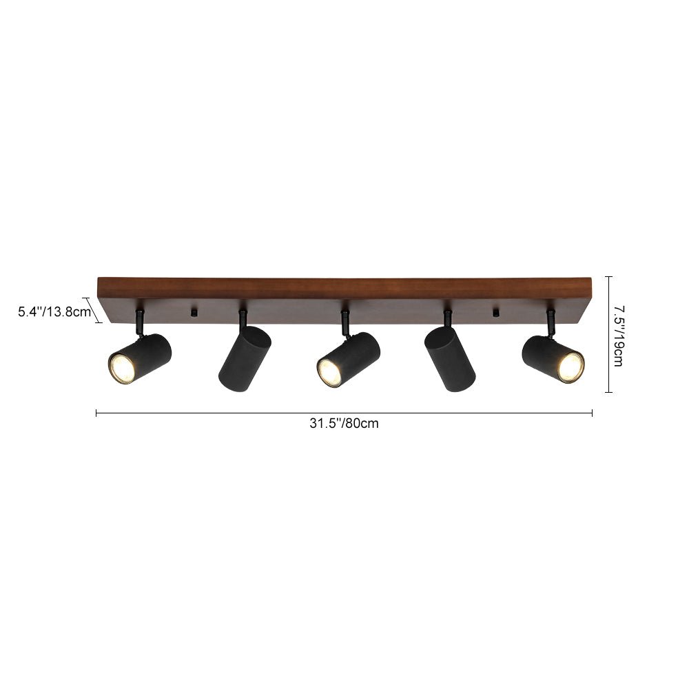 Blends modern rustic charm with functional precision, this 5-light walnut wood semi-flush track light features linear walnut wood backplate anchors adjustable black light heads, which can be angled to cast light exactly where you need it, whether highlighting kitchen counters, artwork, or a cozy seating nook. The warm walnut grain pairs with sleek black finish, creating a balanced aesthetic that feels both grounded and refined. It shines in modern rustic, farmhouse, or transitional interiors, making it ideal for kitchens, dining areas, living rooms, or home offices.