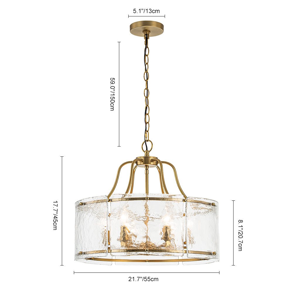 Crafted to perfection, this stunning 6-light rippled glass pendant boasts a drum frame finished in stylish brass, exquisitely adorned with six gracefully handmade curved rippled glass elements that elegantly complement its design. Within the drum structure, six E12 bulbs (not included) await, ready to emit a warm and welcoming ambient glow that bathes your room in unparalleled sophistication. As you switch on the light, the fixture comes to life, casting mesmerizing patterns of light and shadow that dance gracefully throughout your space, adding a touch of magic to every corner. Versatile and breathtaking, this glam drum pendant light is a perfect fit for a variety of rooms, including living rooms, dining areas, bedrooms, kitchens, entryways, and even offices. Whether you're looking to create a cozy ambiance in your living space or add a touch of glamour to your dining area, this exquisite pendant light is sure to make a statement wherever it's placed.