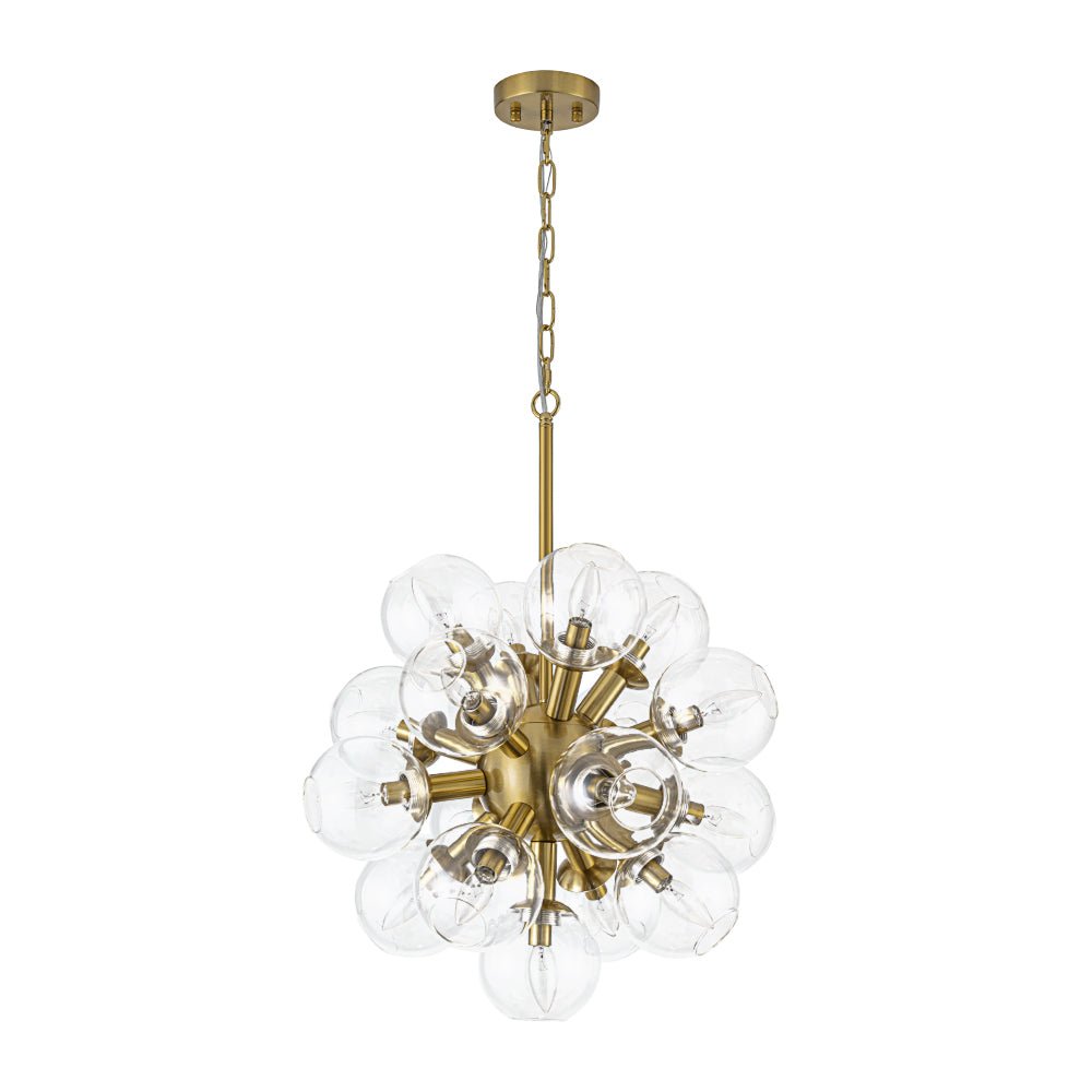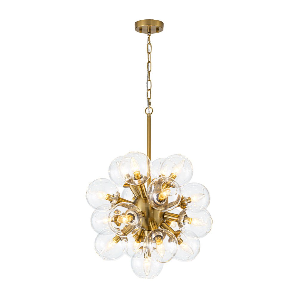 Radiant, airy, and strikingly sculptural, this modern 17-light firework sphere chandelier brings an unforgettable burst of mid-century modern charm to any interior. From its polished metallic core, evenly spaced cylindrical lamp holders stretch outward, forming a perfectly balanced globe silhouette. Each arm supports a hand-blown transparent glass shade, whose open-ended design creates an effortless lightness—almost as if the fixture were floating midair. When illuminated, the fixture resembles a dazzling firework blooming against the night sky, its warm glow reflecting gently through the crystal-clear globes. The harmony between sleek metal and airy glass gives the chandelier a sophisticated yet spirited presence, making it an ideal statement piece for modern living rooms, dining rooms, kitchens, bedrooms, bathrooms, or elegant entryways. Whether you’re aiming to elevate a contemporary home or highlight a mid-century–inspired space, this bold design infuses any room with artistry, balance, and luminous beauty.