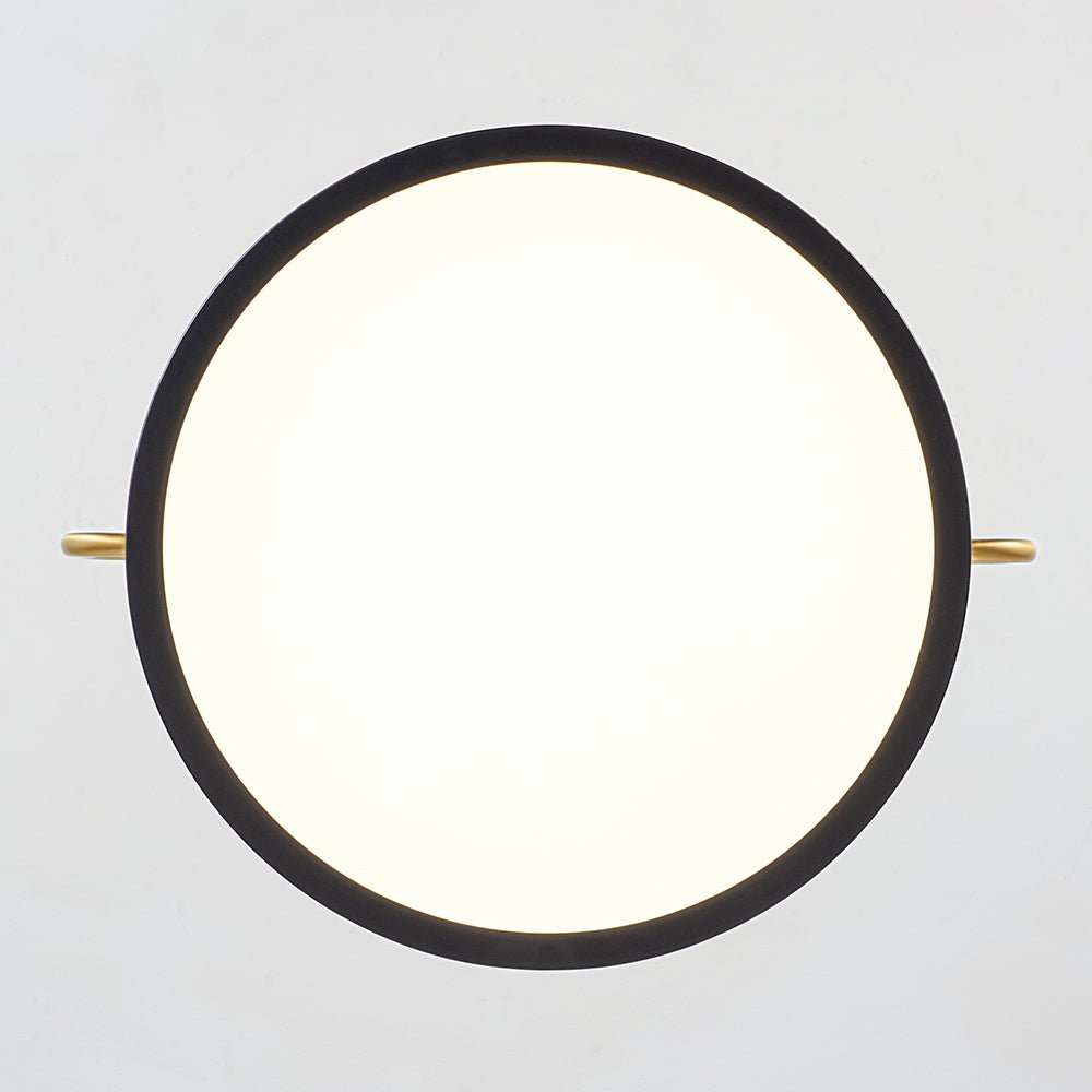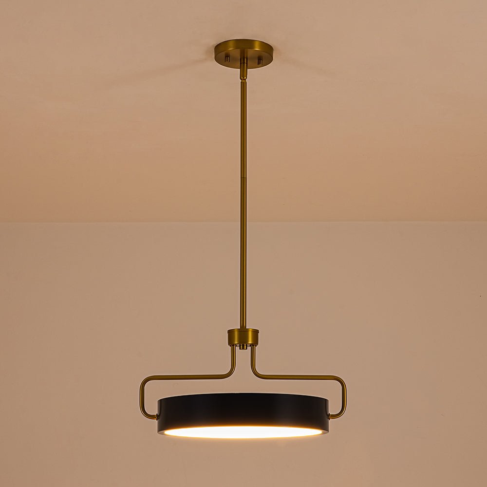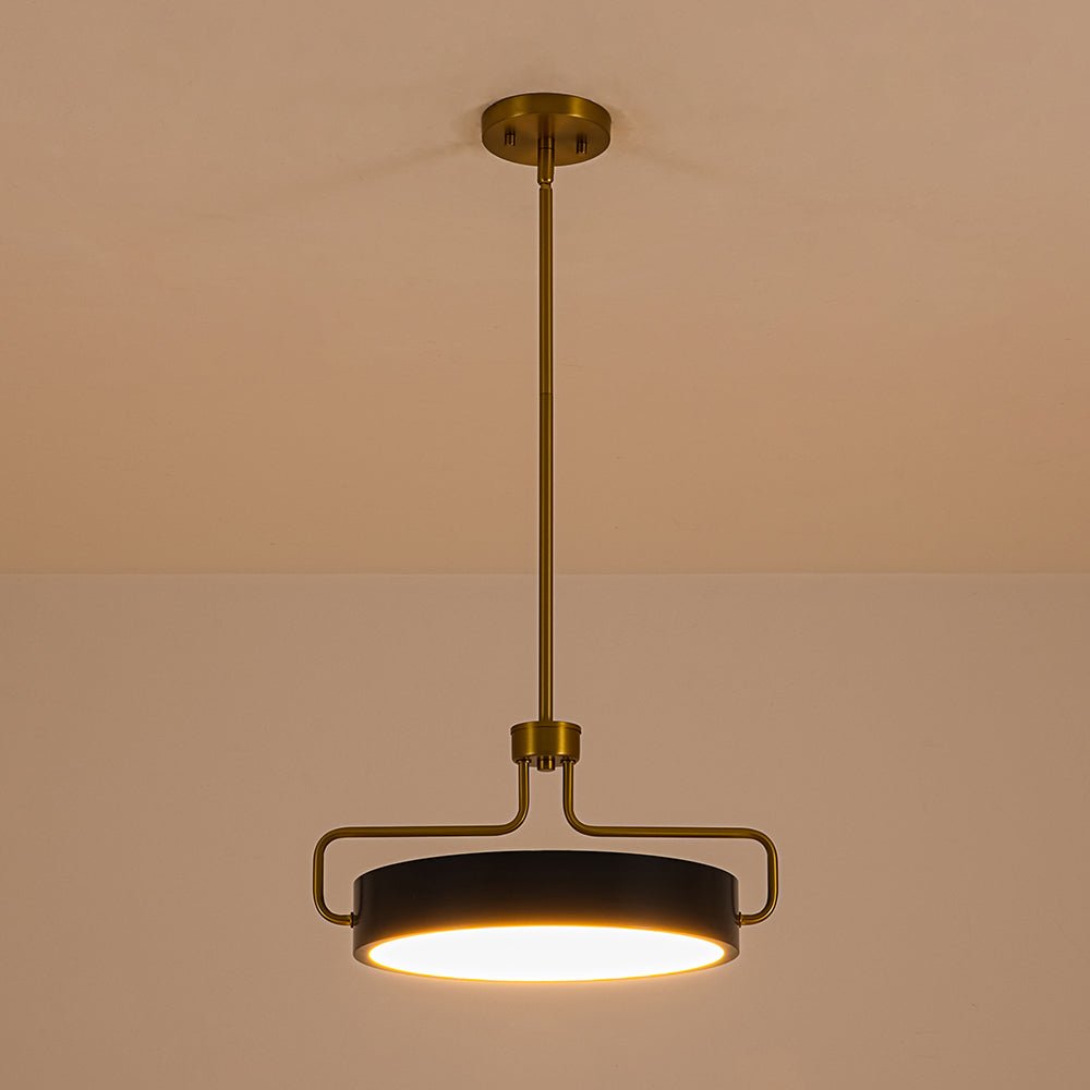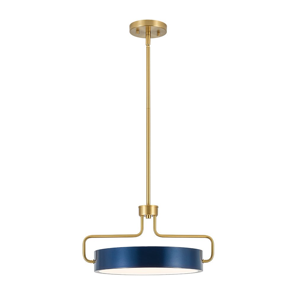 Balances sleek modernity with Scandinavian-inspired calm, this dimmable LED geometric drum pendant features a low-profile, round drum in deep navy blue, with a flat, circular white acrylic diffuser at the bottom. Suspended by a U-shaped brass frame that wraps around its sides, connecting to a central vertical brass stem and circular brass ceiling plate, it merges the compact, rounded form of a drum light with linear, angular support lines for a contemporary, balanced shape. Ideal for modern, contemporary, Nordic and Scandinavian interiors, it elevates dining rooms, kitchen islands, or living areas with understated sophistication.