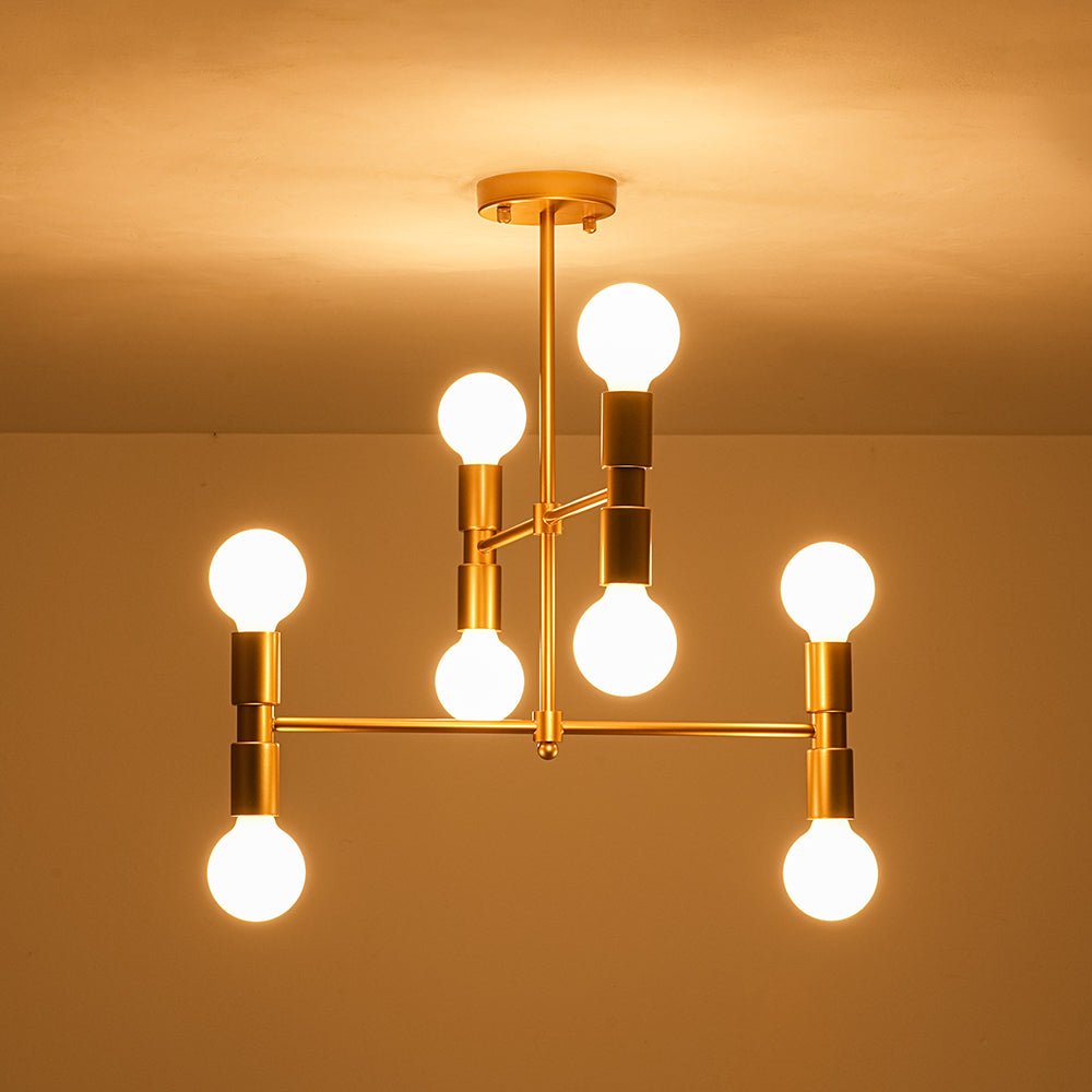 Channels a kinda mid-century modern elegance, this 8-light crossing arm tiered linear chandelier features warm painted brass finish and symmetrical dual lamp holder design create a balanced, retro-inspired silhouette that feels both timeless and fresh. With no shades included, it lets your choice of bulbs take center stage, casting a customizable glow. It infuses spaces with understated sophistication, suiting mid-century modern, transitional, or contemporary interiors, ideal for dining rooms, open-concept living areas, or statement entryways.
