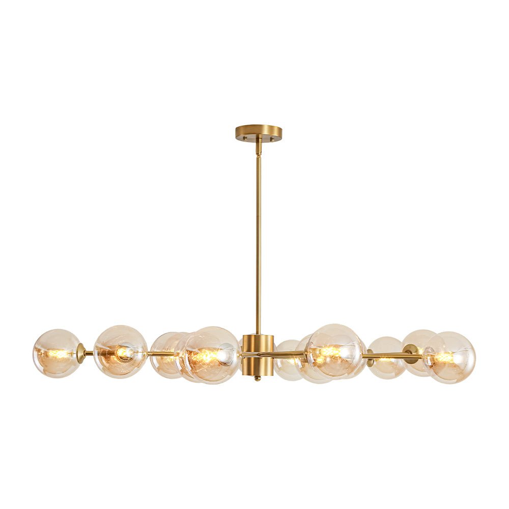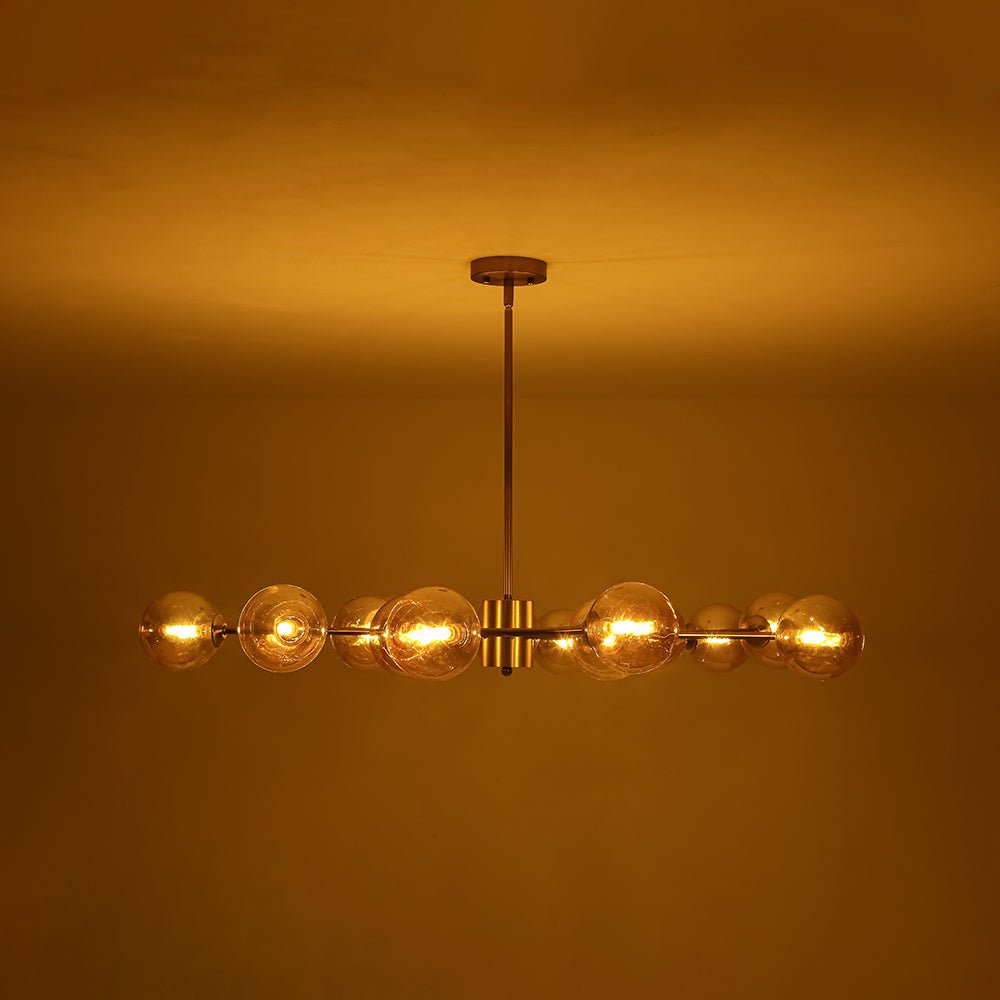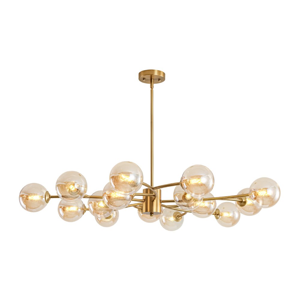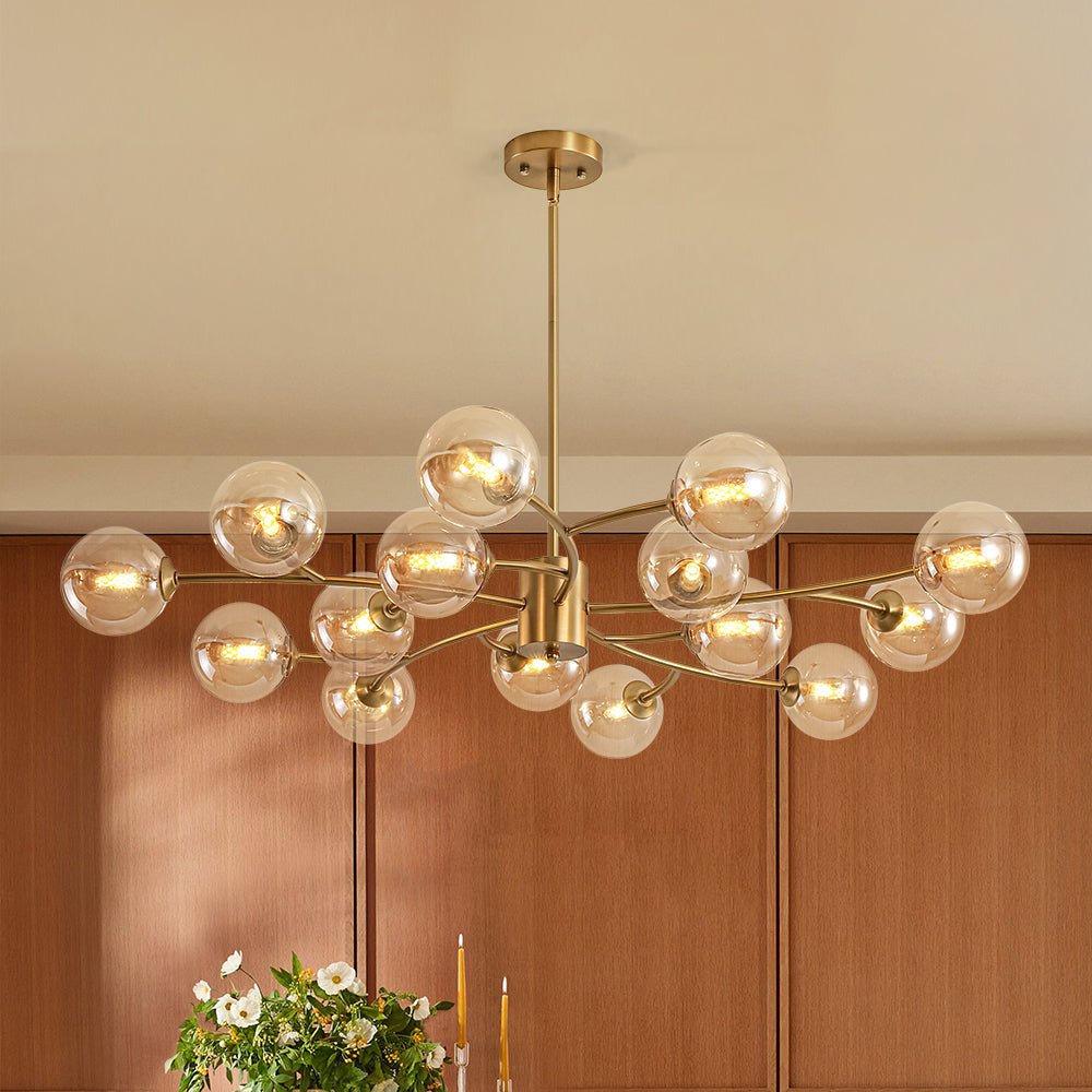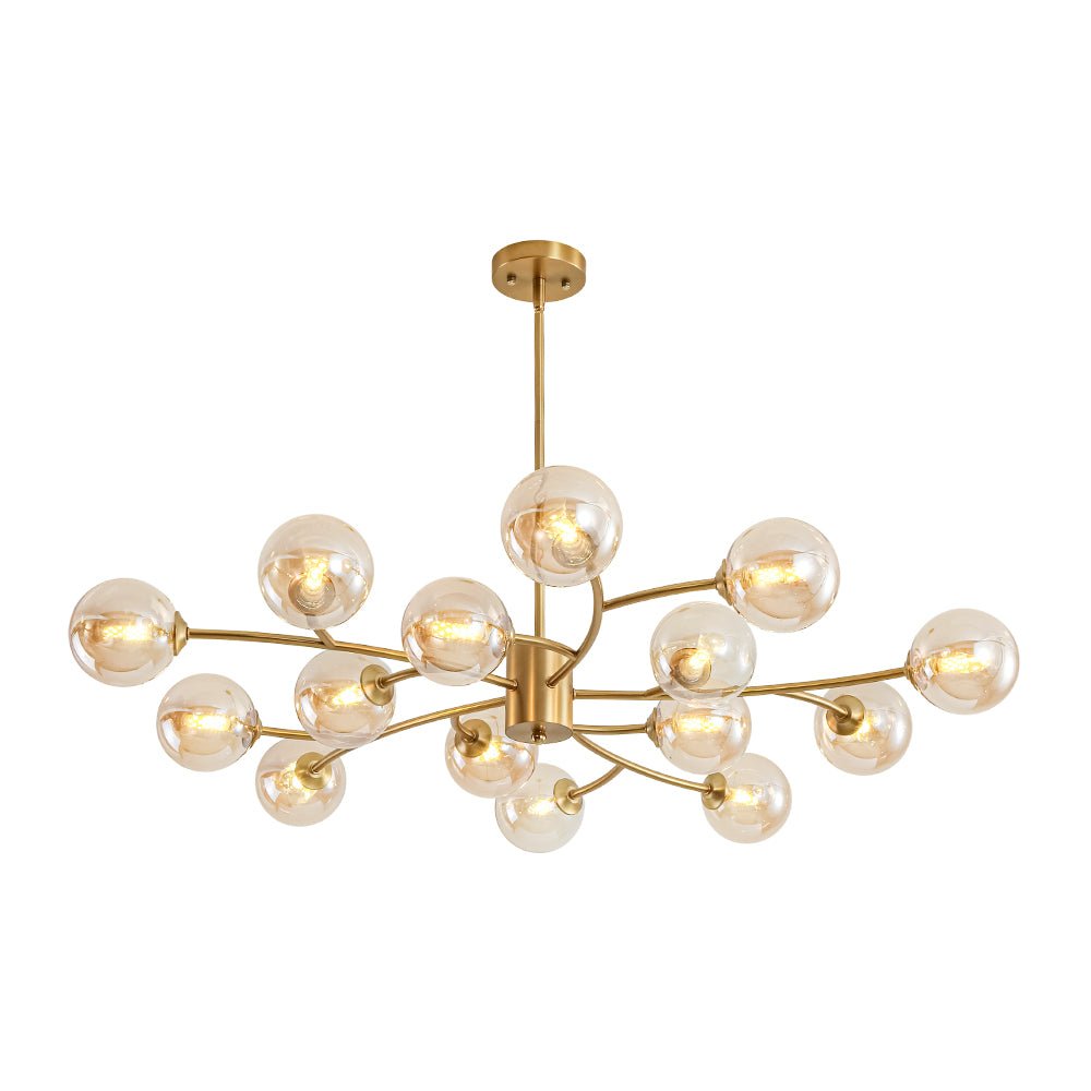 Dramatic yet trendy, this 15-light amber glass vortex branch chandelier blends celestial charm with natural elegance: its brass branching arms and clustered opal globes evoke a luminous celestial bouquet, glowing blooms, or orb-like stars suspended in a refined, airy formation. It reads as a gilded constellation too: curved arms and evenly spaced orbs mirror a stylized star pattern, while amber glass globes soften it into a polished cloud sunset-tone cluster, anchored by warm metallic structure. It infuses spaces with refined drama, suiting eclectic modern, transitional, or soft traditional interiors, ideal for living rooms, formal dining areas, or statement entryways.
