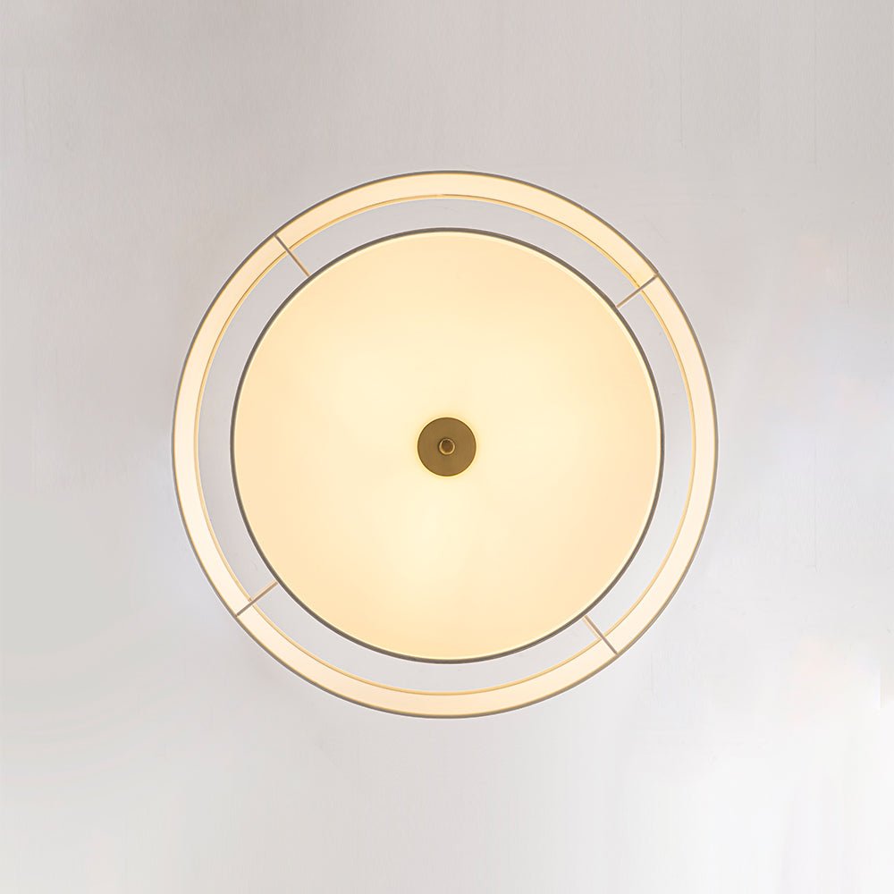 • Layered white fabric drum shade + brass/matte black finish