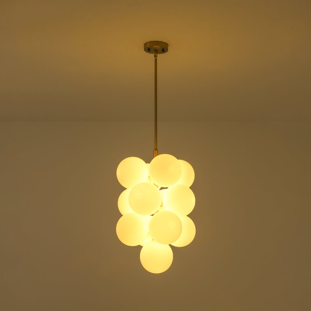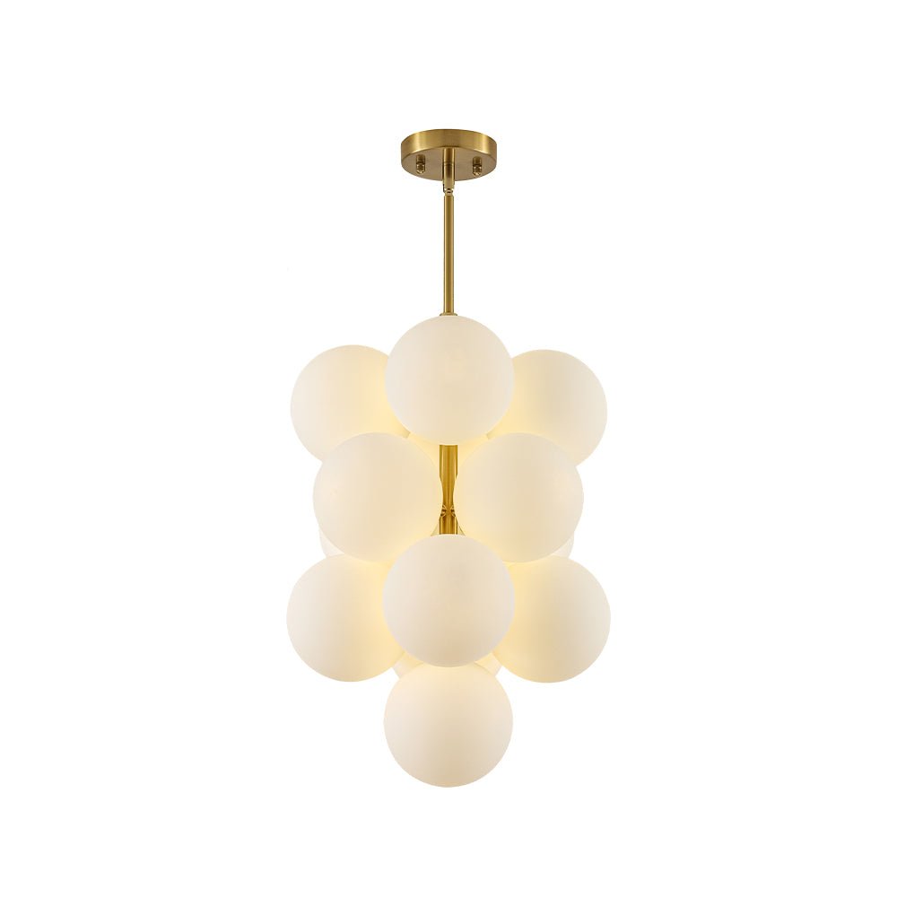 Inspired by the graceful form of nature’s harvest, the ornate glam 13-light frosted glass white grape chandelier reimagines the organic charm of a grape cluster into a work of contemporary elegance. Each frosted white globe mimics the softness of grape, diffusing light through its milky surface to create a soothing, dreamlike glow. Suspended in a cascading cluster silhouette, this fixture draws the eye upward—perfect for spaces that celebrate vertical aesthetics. Whether illuminating a living room, dining room, kitchen, entryway, staircase, or hallway, its luminous presence adds texture, depth, and modern opulence to your home. A statement piece that balances natural inspiration with refined artistry.