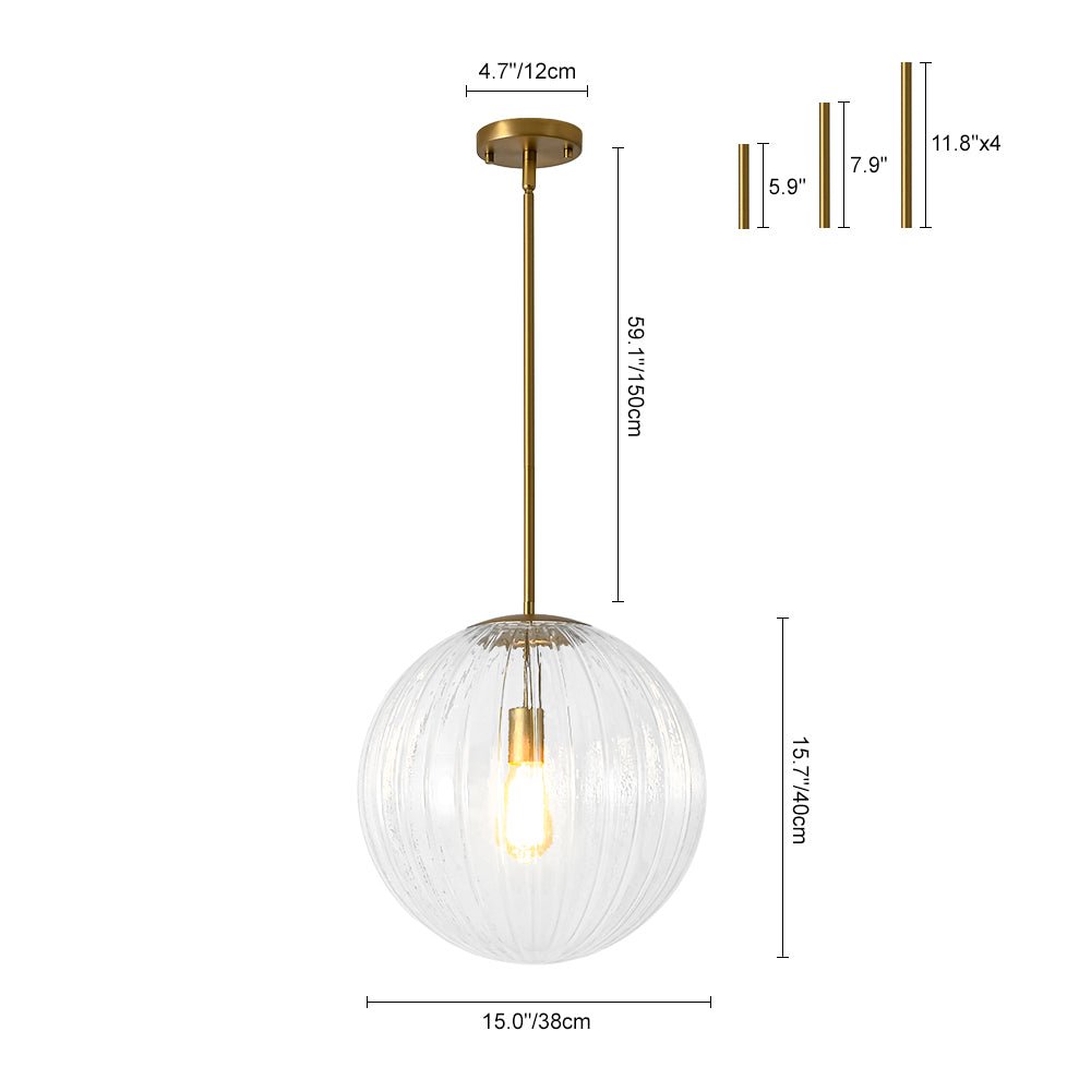 Discover refined elegance with this Minimalist modern 1-light Ribbed clear glass globe pendant, a thoughtfully designed lighting fixture that brings understated sophistication to discerning interiors. The meticulously crafted ribbed clear glass diffuses light with remarkable clarity, casting an enchanting sunburst-like reflection across your walls, a subtle yet captivating focal point. This exceptional pendant is height-adjustable, allowing seamless conversion between a graceful hanging pendant and a refined semi-flush mount configuration. Whether adorning a contemporary kitchen islands, minimalist dining rooms, transitional office, or reading nook, cozy rest corner, this versatile fixture adapts to your design vision with effortless grace.Â
