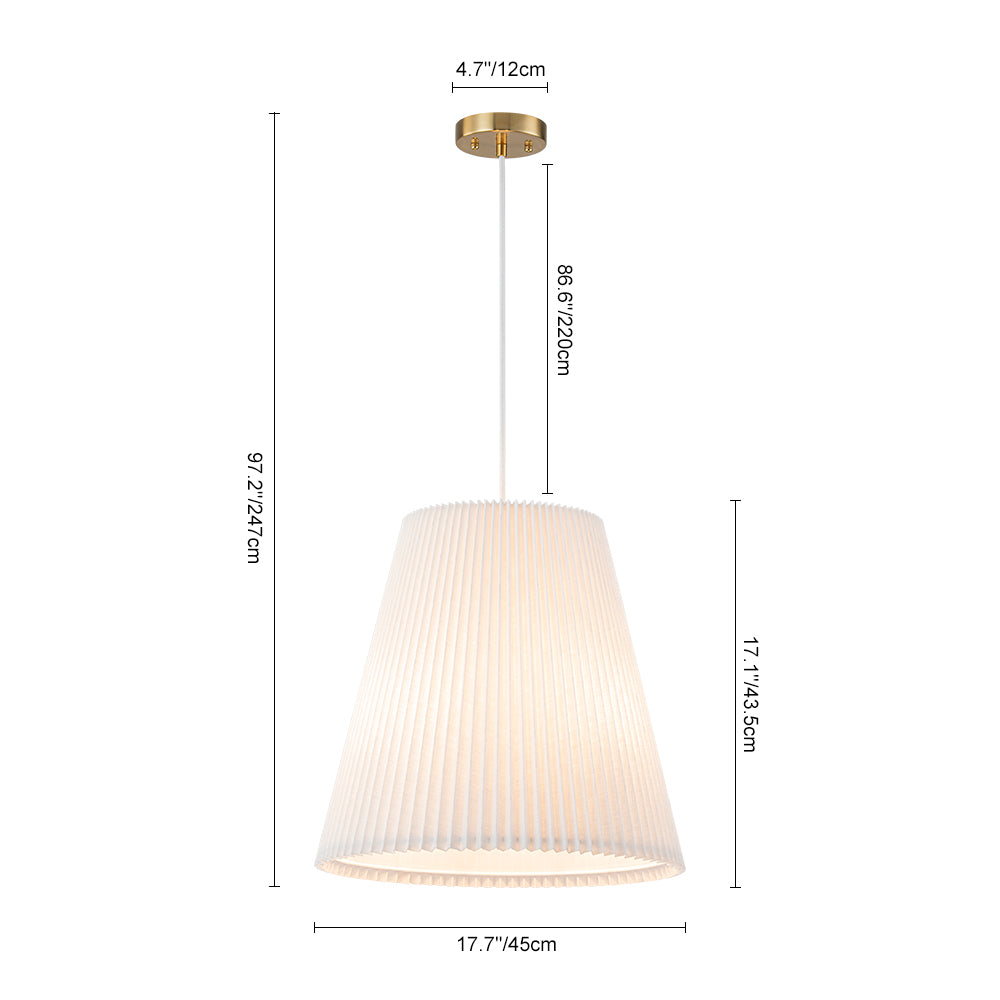 Inspired by the graceful flow of a woman’s A-line pleated skirt, the 3-light pleated drum pendant brings an elegant and textured charm to your space. The intricate pleating adds depth and dimension, creating a visual appeal that draws the eye. Its conical drum silhouette stands apart from ordinary hanging lights, offering a unique and stylish statement to any room. This pendant is perfect for modern rustic, contemporary, or transitional interiors, adding warmth and sophistication to living rooms, dining areas, kitchens, bedrooms, or entryways. The soft glow from the frosted glass diffuses light evenly, creating a cozy and inviting atmosphere while highlighting the dynamic pleated fabric design.