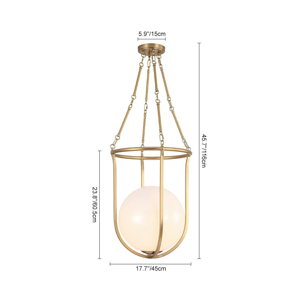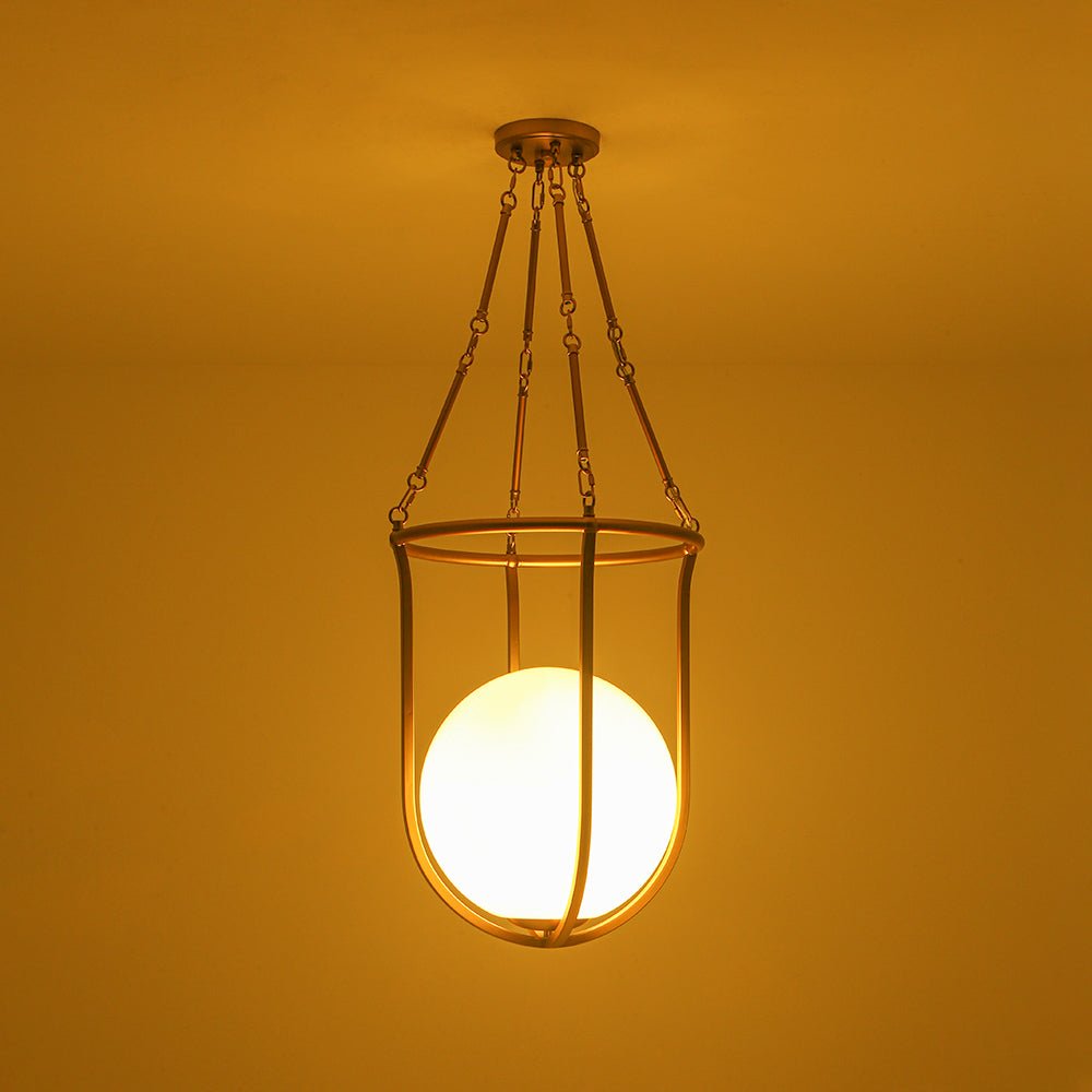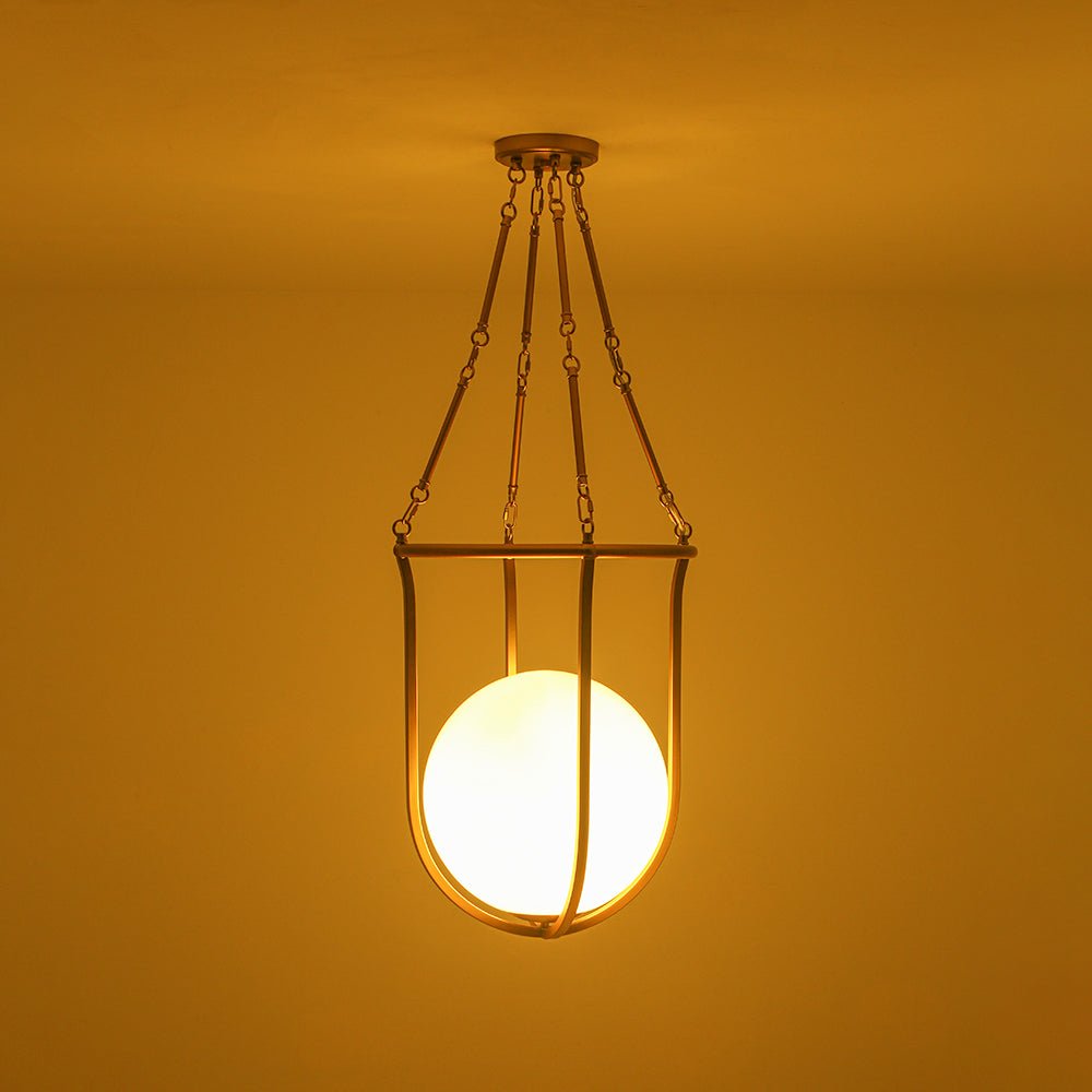 Draws inspiration from a basketball’s iconic silhouette, this 1-light basketed opal glossy glass semi-flush mount pairs a smooth, rounded opal glass shade with a sleek, open brass frame to create a playful yet refined focal point. Its mid-century modern vibe shines through the balanced contrast of warm metal and soft, diffusing glass, delivering a gentle, ambient glow that adds quiet visual impact. It elevates spaces with understated charm, suiting mid-century modern, transitional, or contemporary interiors, ideal for kitchens, dining nooks, entryways, or powder rooms.