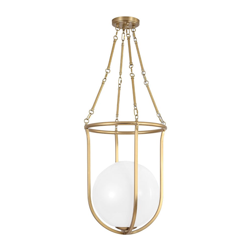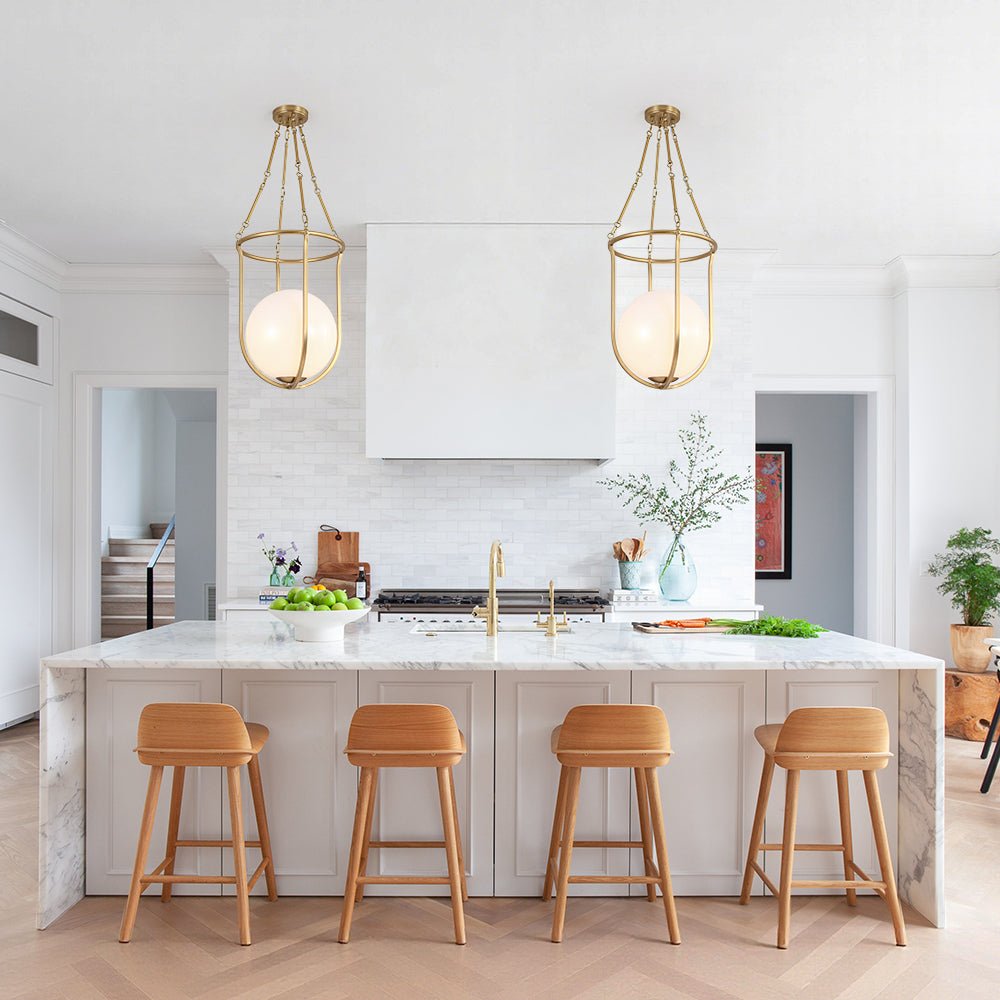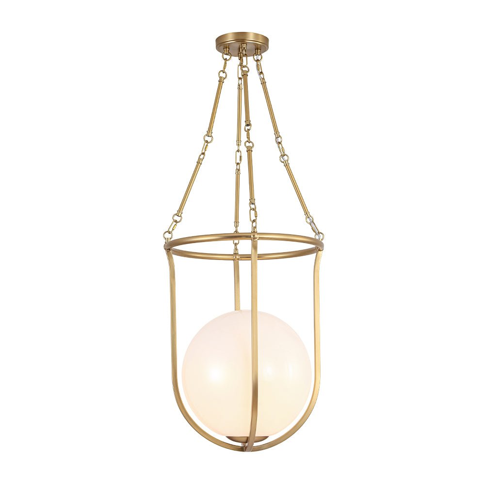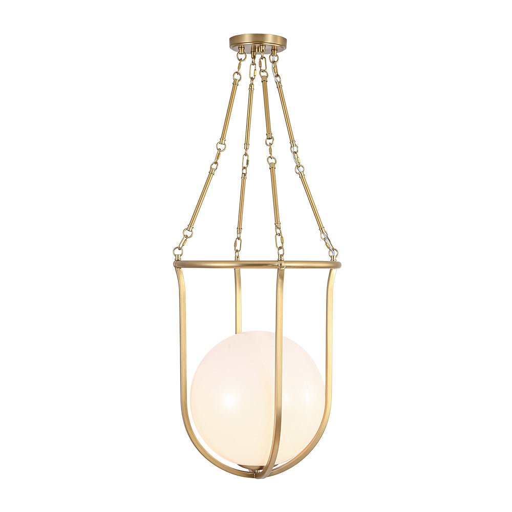 Draws inspiration from a basketball’s iconic silhouette, this 1-light basketed opal glossy glass semi-flush mount pairs a smooth, rounded opal glass shade with a sleek, open brass frame to create a playful yet refined focal point. Its mid-century modern vibe shines through the balanced contrast of warm metal and soft, diffusing glass, delivering a gentle, ambient glow that adds quiet visual impact. It elevates spaces with understated charm, suiting mid-century modern, transitional, or contemporary interiors, ideal for kitchens, dining nooks, entryways, or powder rooms.