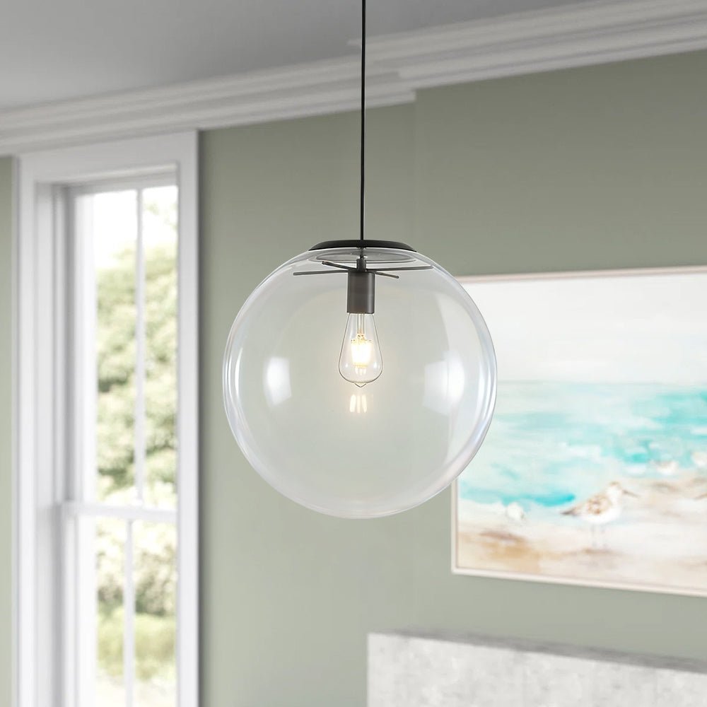 Sleek, simple, and strikingly elegant, the contemporary 1-light clear glass single sphere pendan celebrates the timeless beauty of minimal design. Crafted with a transparent glass globe, it exudes a crisp yet trendy look that fits effortlessly into both modern and transitional interiors. The clear shade beautifully showcases your bulb of choice, casting a warm and inviting glow perfect for kitchen islands, dining nooks, or entryways. Hang a single pendant for a touch of charm, or arrange two to three in a row to create a stunning cluster effect that enhances depth and dimension. With its clean lines and airy silhouette, this pendant adds instant sophistication while maintaining a sense of understated charm.